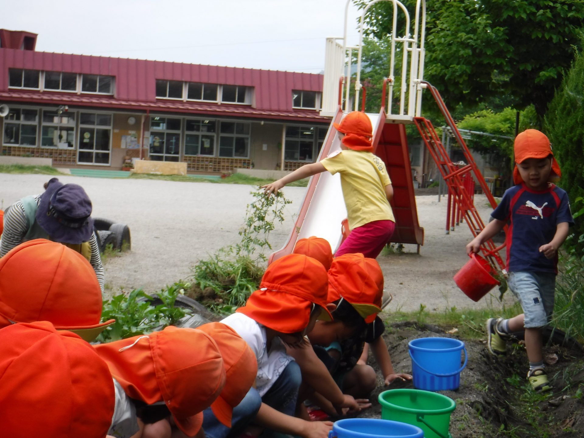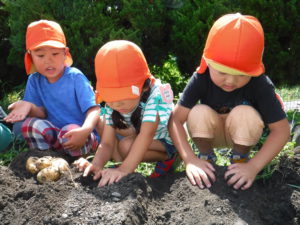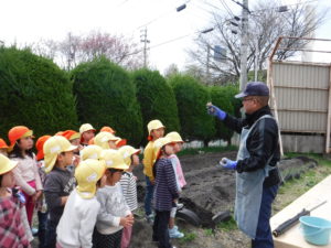 年長さん。真剣にお話を聞いてから、みんなでジャガイモを植えてみよう!!