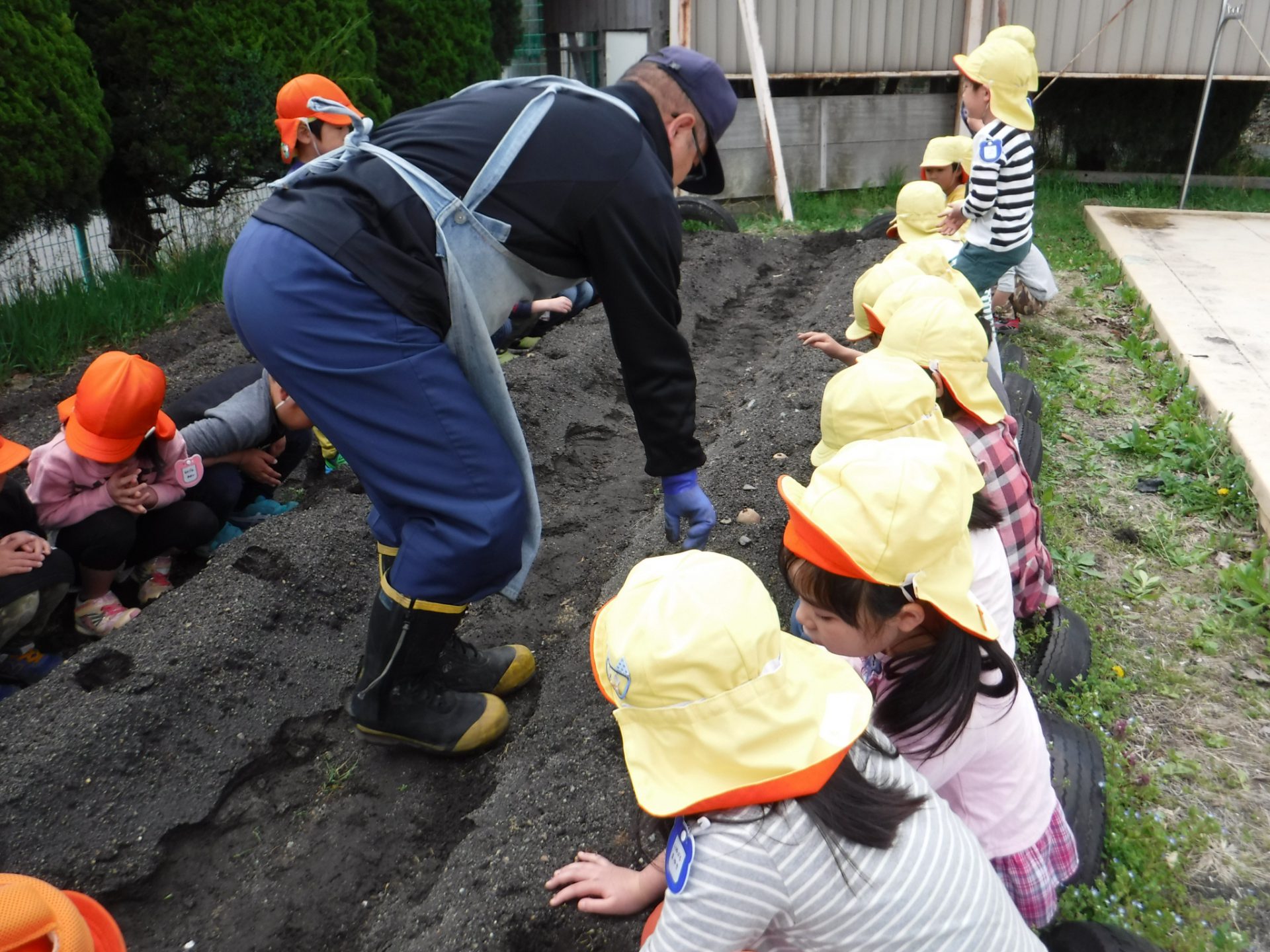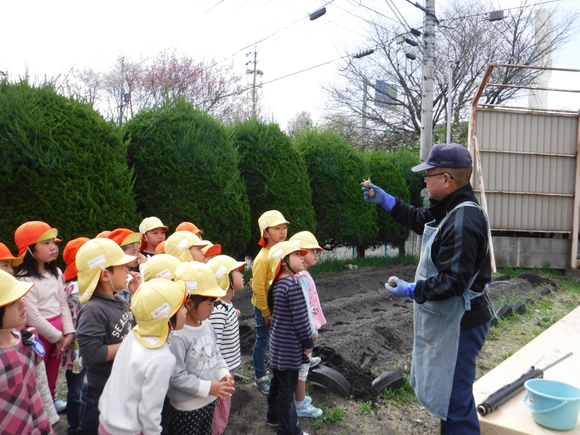 4月。おじいちゃん先生からジャガイモの《種イモ》の植え方を、教えてもらいました。
