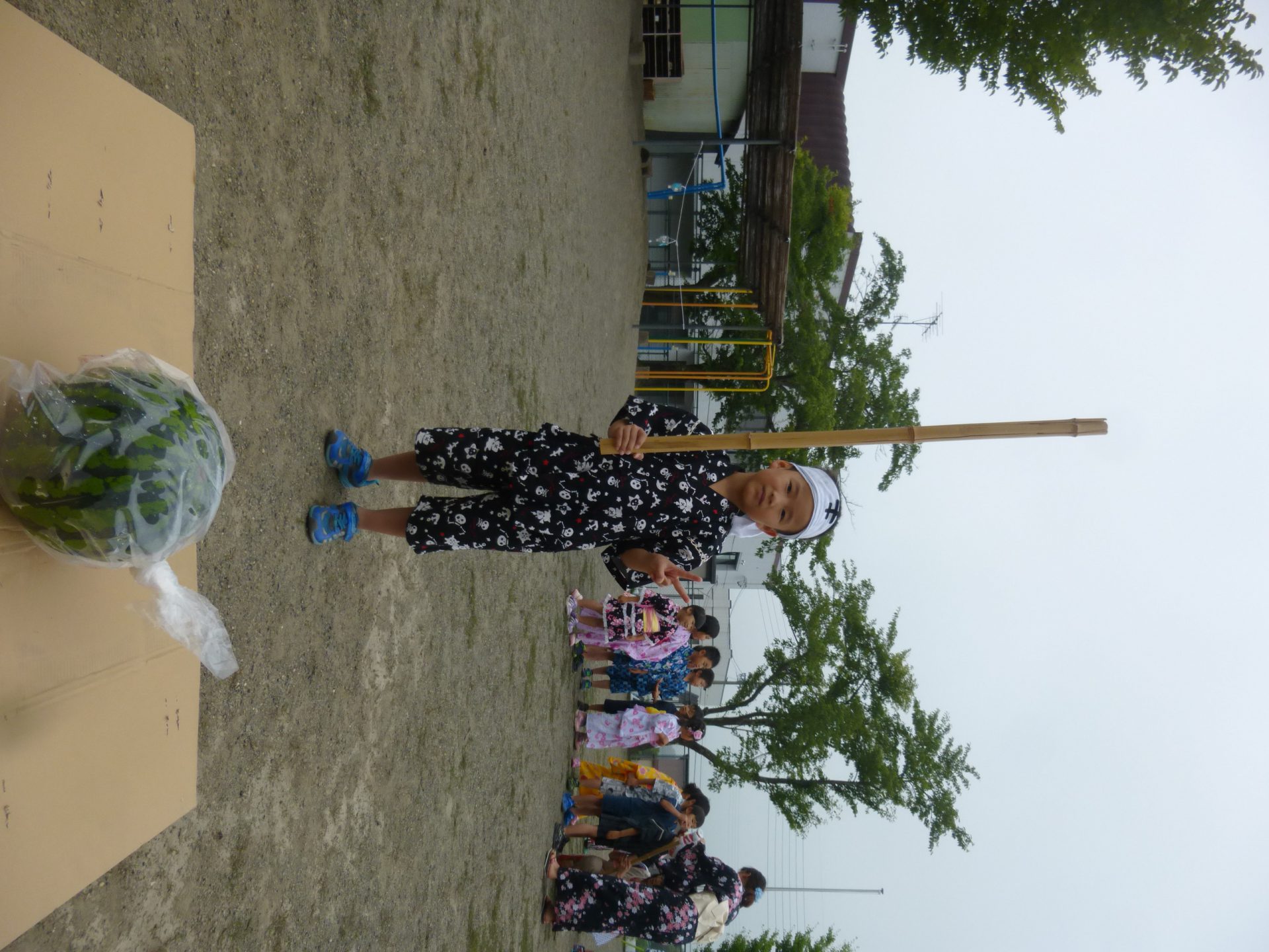 スイカ割り・・・目隠しして、友達や先生たちの声をたよりに、思い切り棒を振り上げて『せーの!』