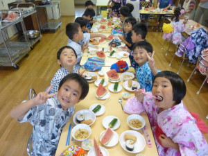 夕食・・・給食の先生が年長さんの為に特別メニューを作ってくれました。みんなでいただきまーす!