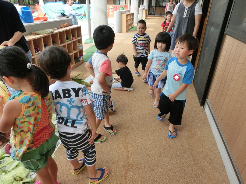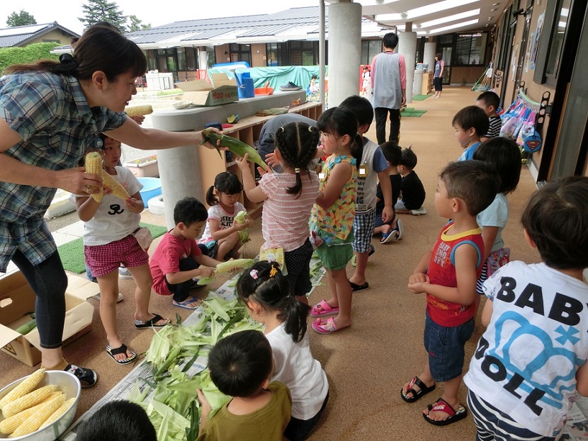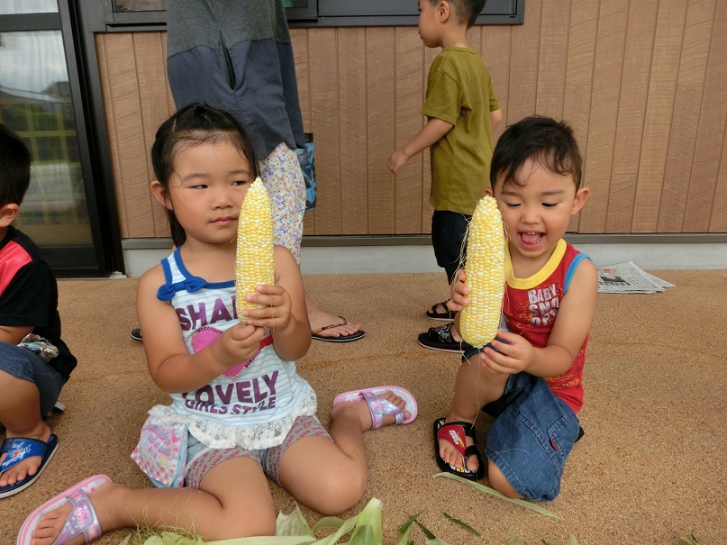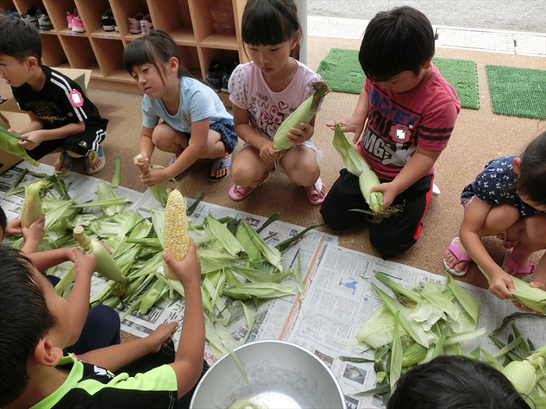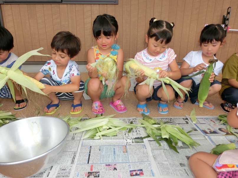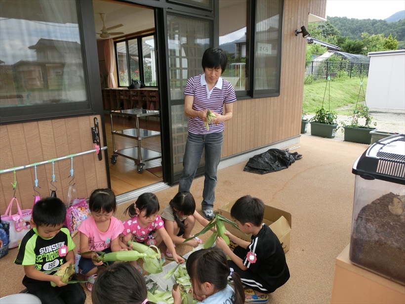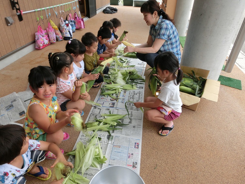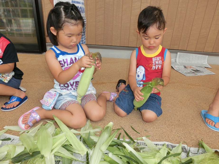 今日のおやつはトウモロコシ。早速年中児がトウモロコシの皮むきを始めました。