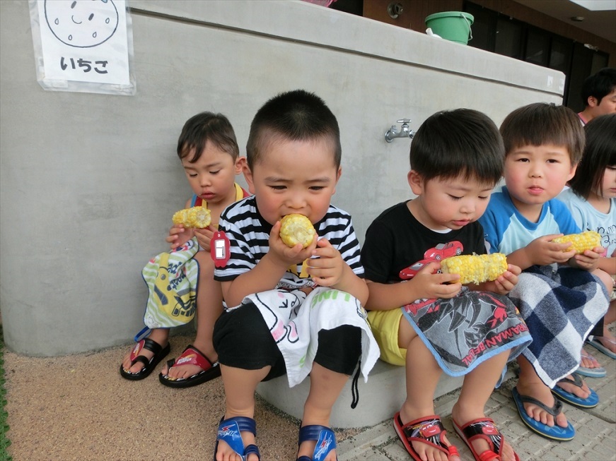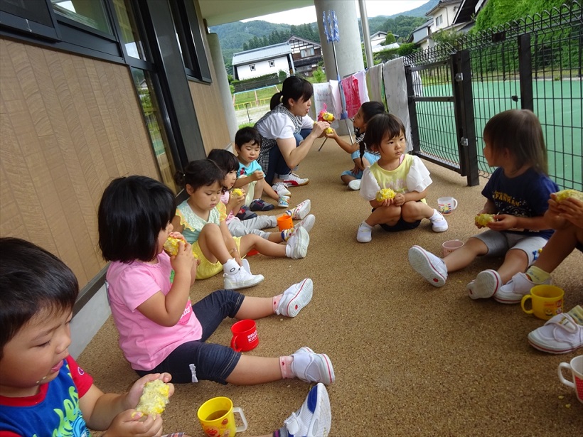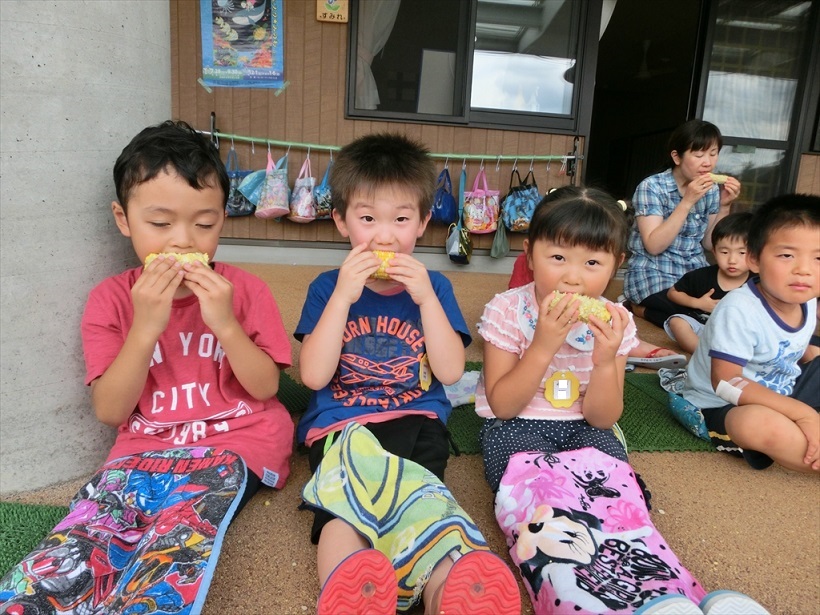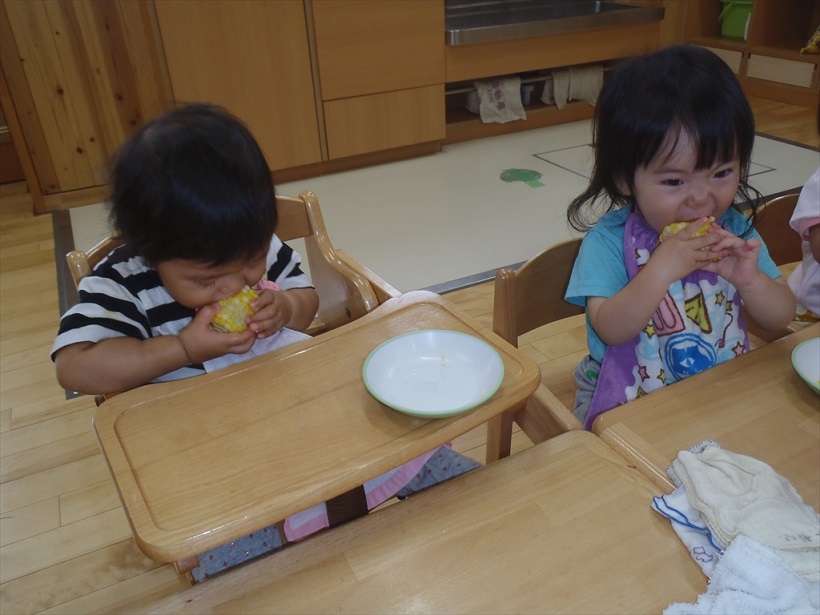 待ちに待ったおやつの時間!今日はもちろんトウモロコシ!!年少児「おいしい!」