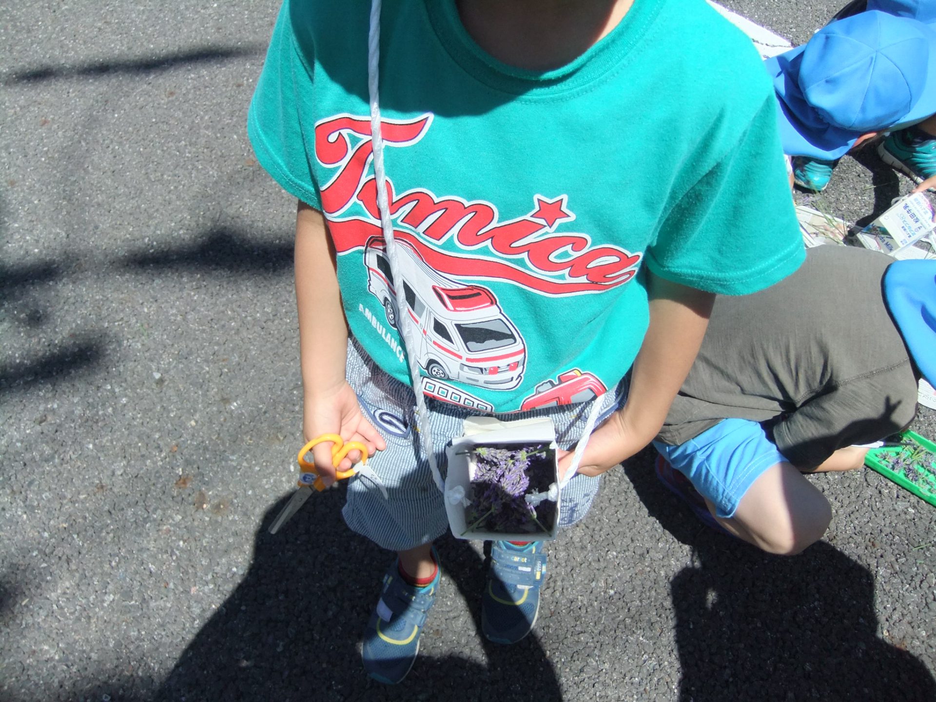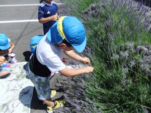保育士が「この花ラベンダーって言うハーブなんだよ。」と教えました。