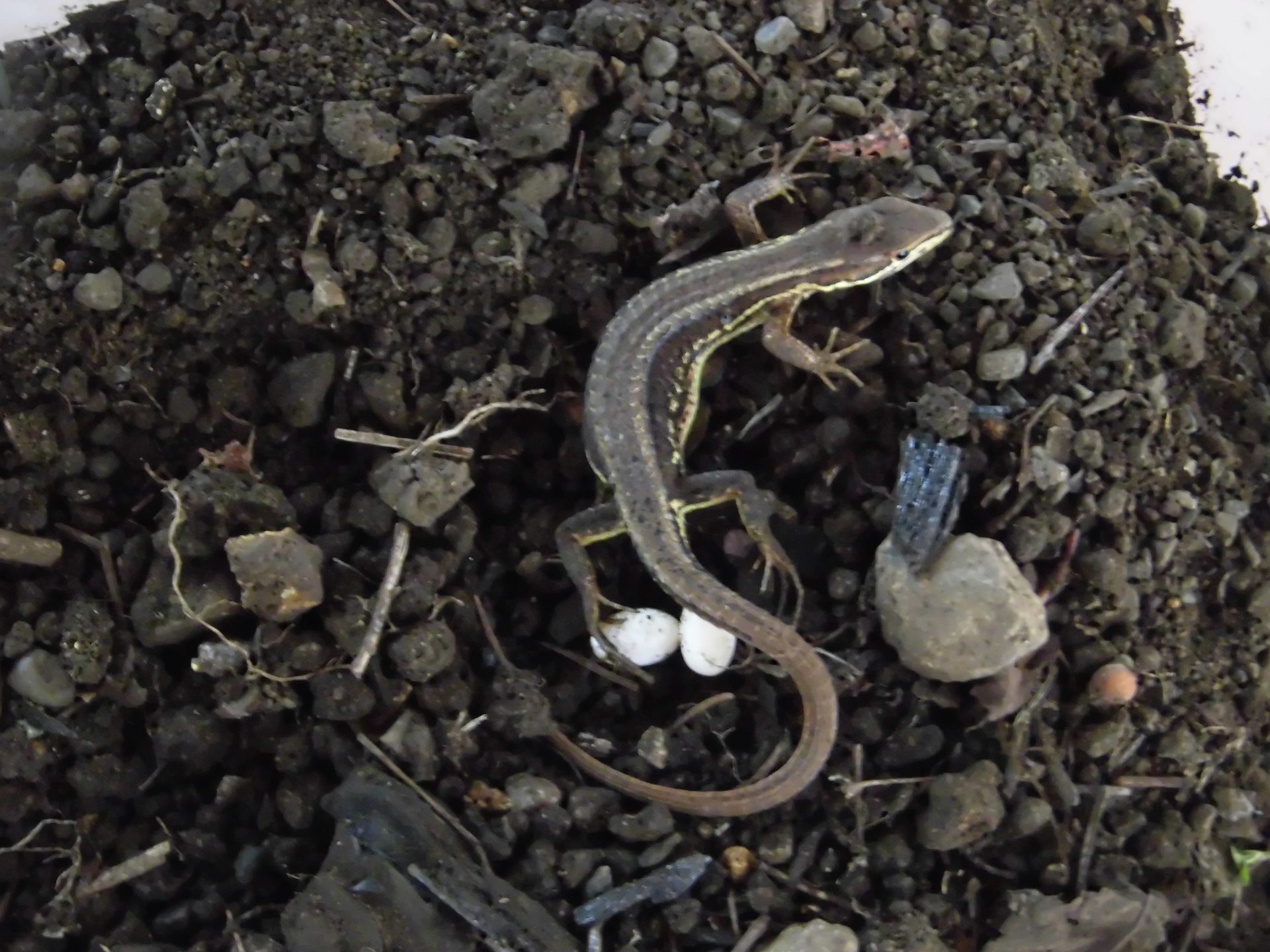 「お腹の大きいカナヘビが居て、卵産んだよ!」