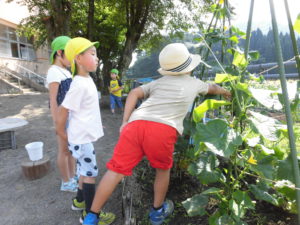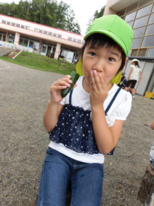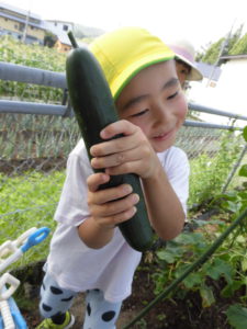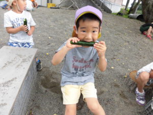 さて、その一方、園庭では夏野菜が実り、収穫時を迎えました。