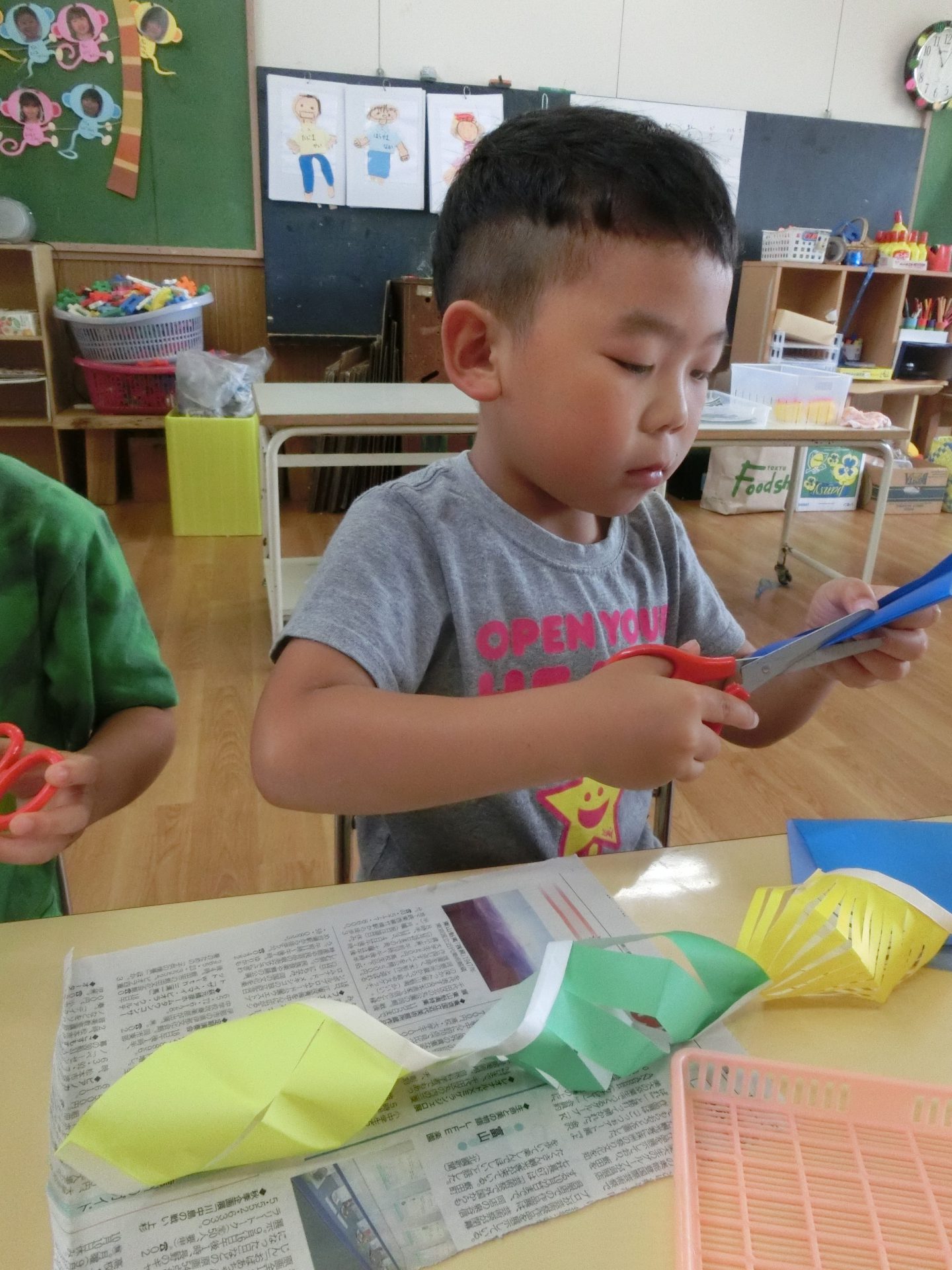 ほしのつどいにも飾る笹飾り、年長さんは貝殻つなぎを作りました。すると、「斜めにしてみようっと。」と切り方を工夫するお友達がいました。おもしろい形になったのを見て「じゃあ丸く切ってみよう!」「細いのと太いのにしてみよう!」といろいろな貝殻が出来ました。