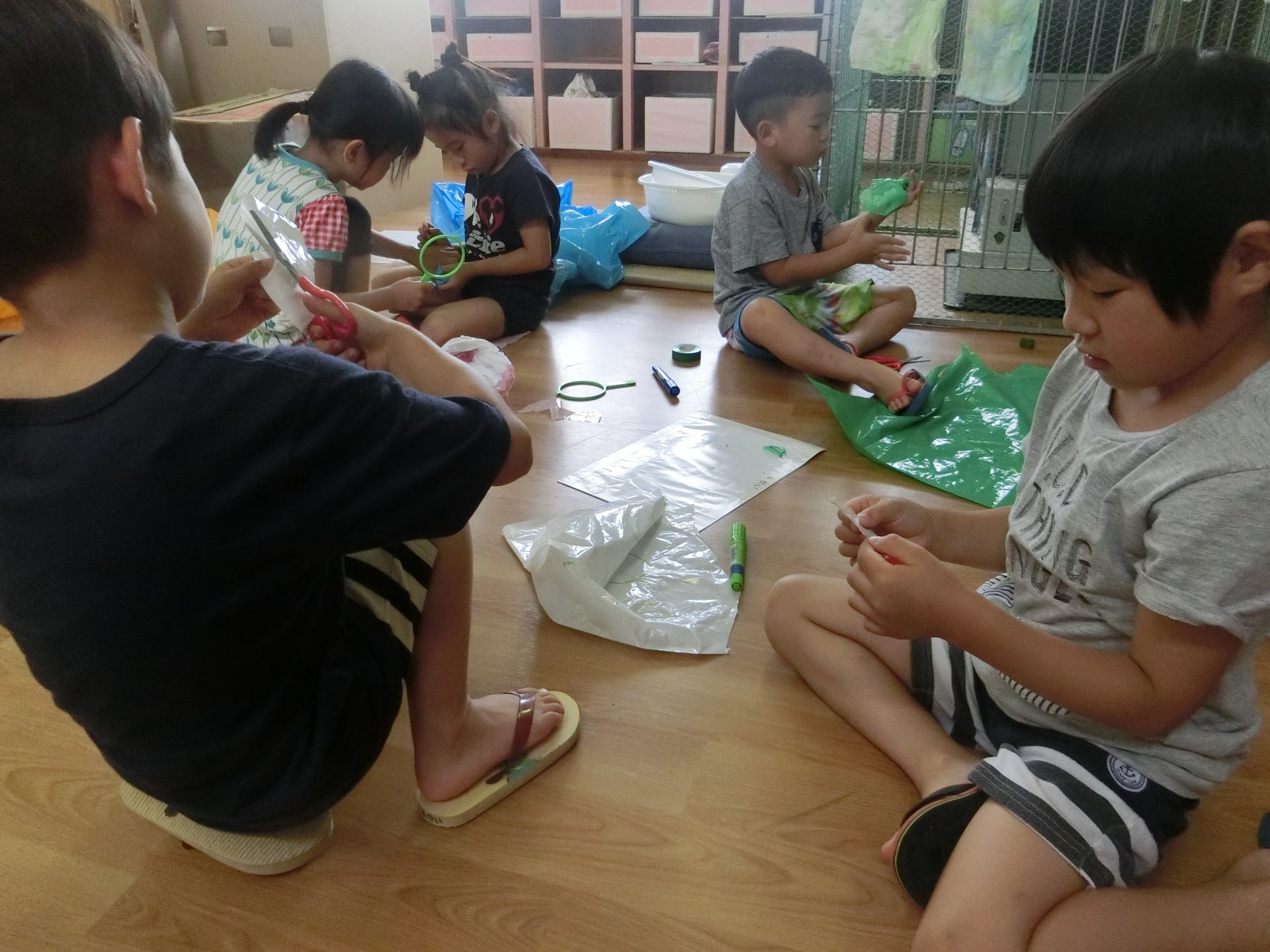 と友達と相談しながら材料を決めていきました。どうやらポイントは水に強いもの、そしてカラフルに見えるもののようでした。友達と話し合いながらそのふたつのポイントをお互いに共有することで、同じ目的で選ぶことが出来ていました。5歳児らしい姿です。