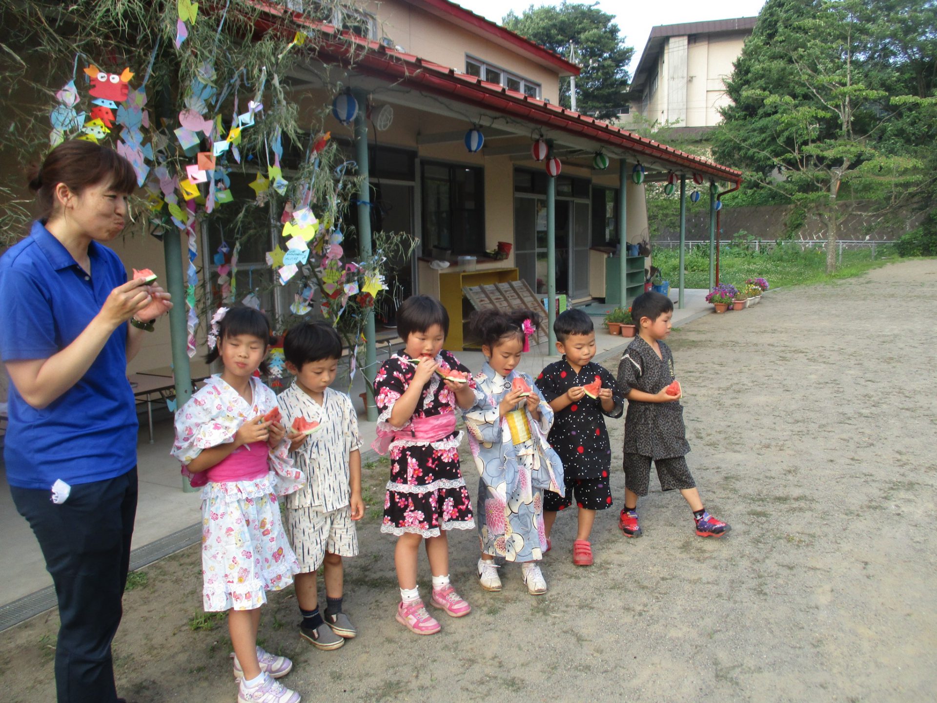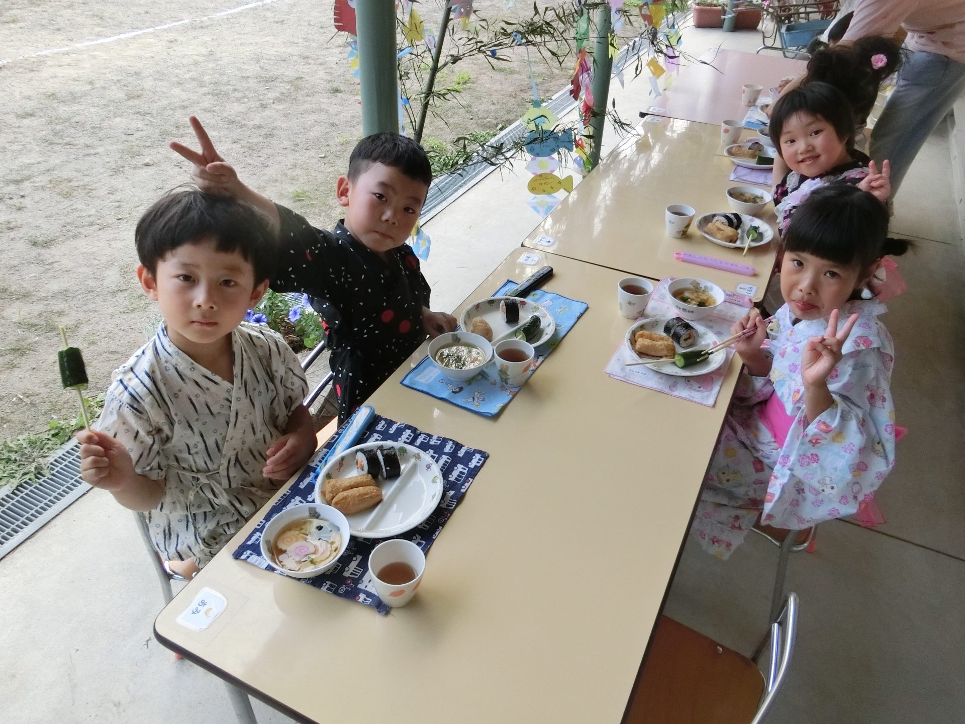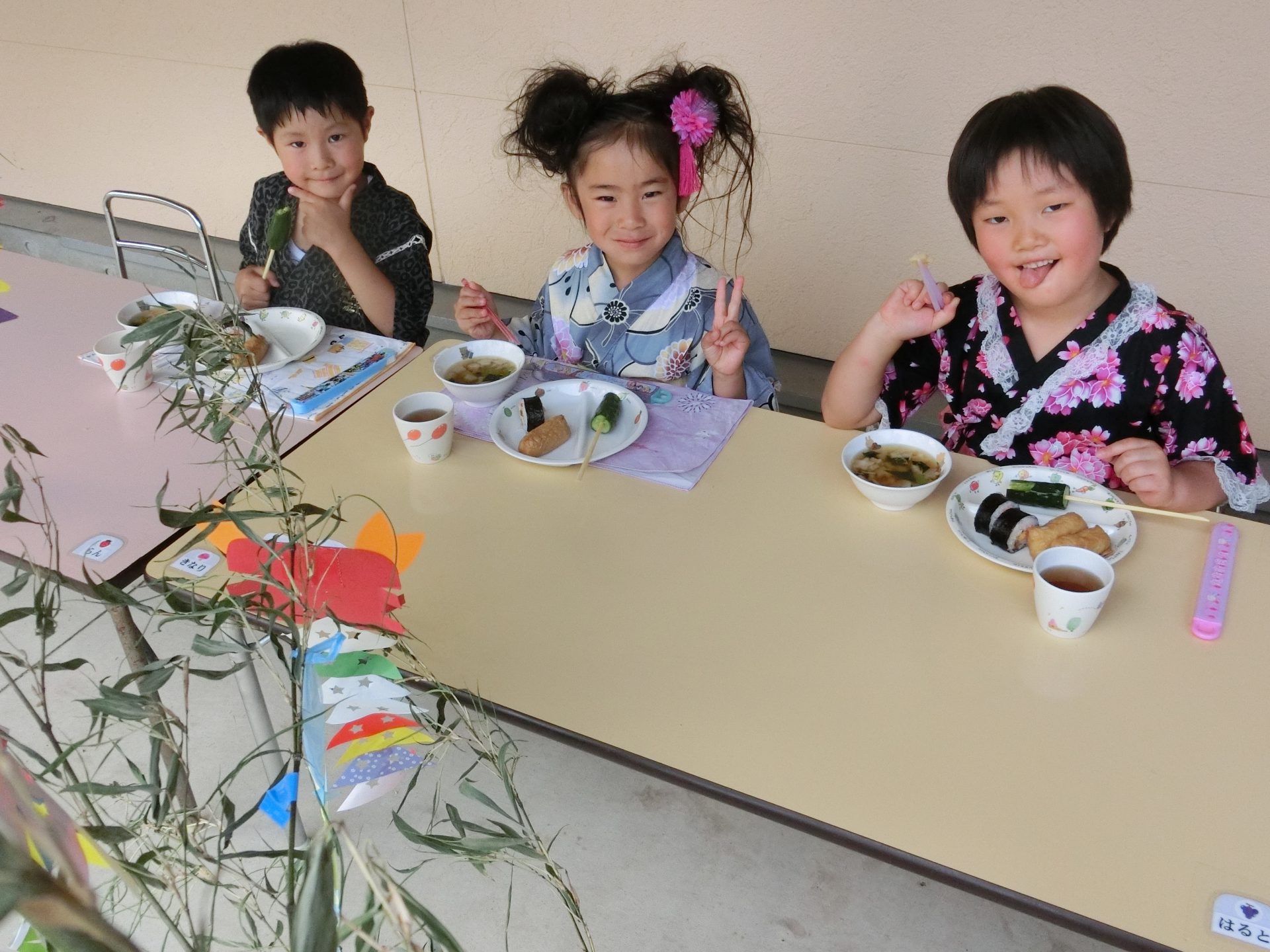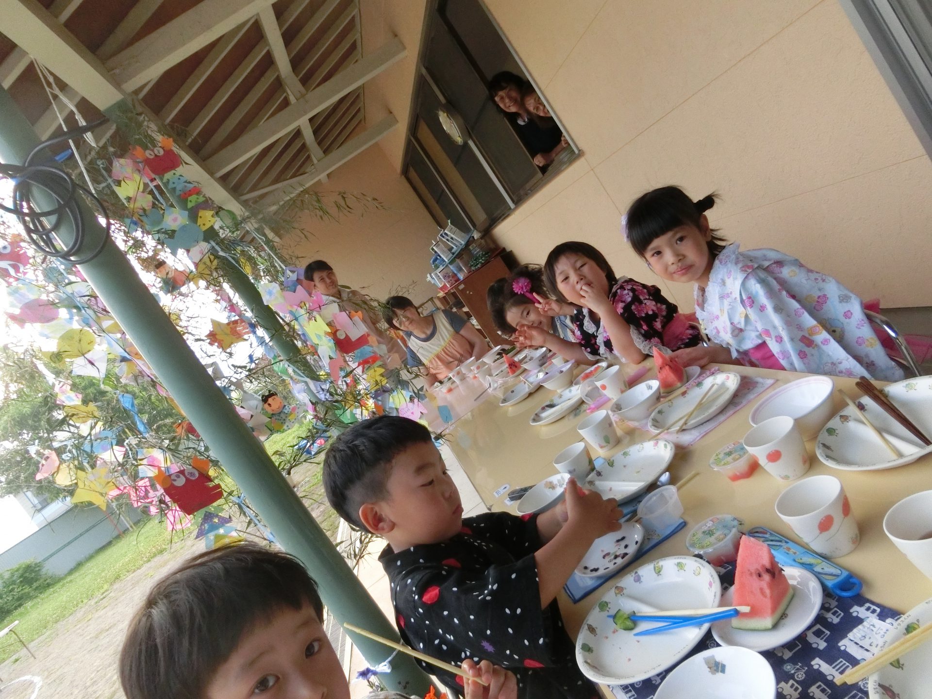 そしてテラスで食べたい!と要望があったので笹飾りの前で夕飯をいただきました。夕方の心地よい風もあり、もりもり食べるみんな!こんなにおかわりをしてくれた年長さんははじめて!たくさんいただきました。