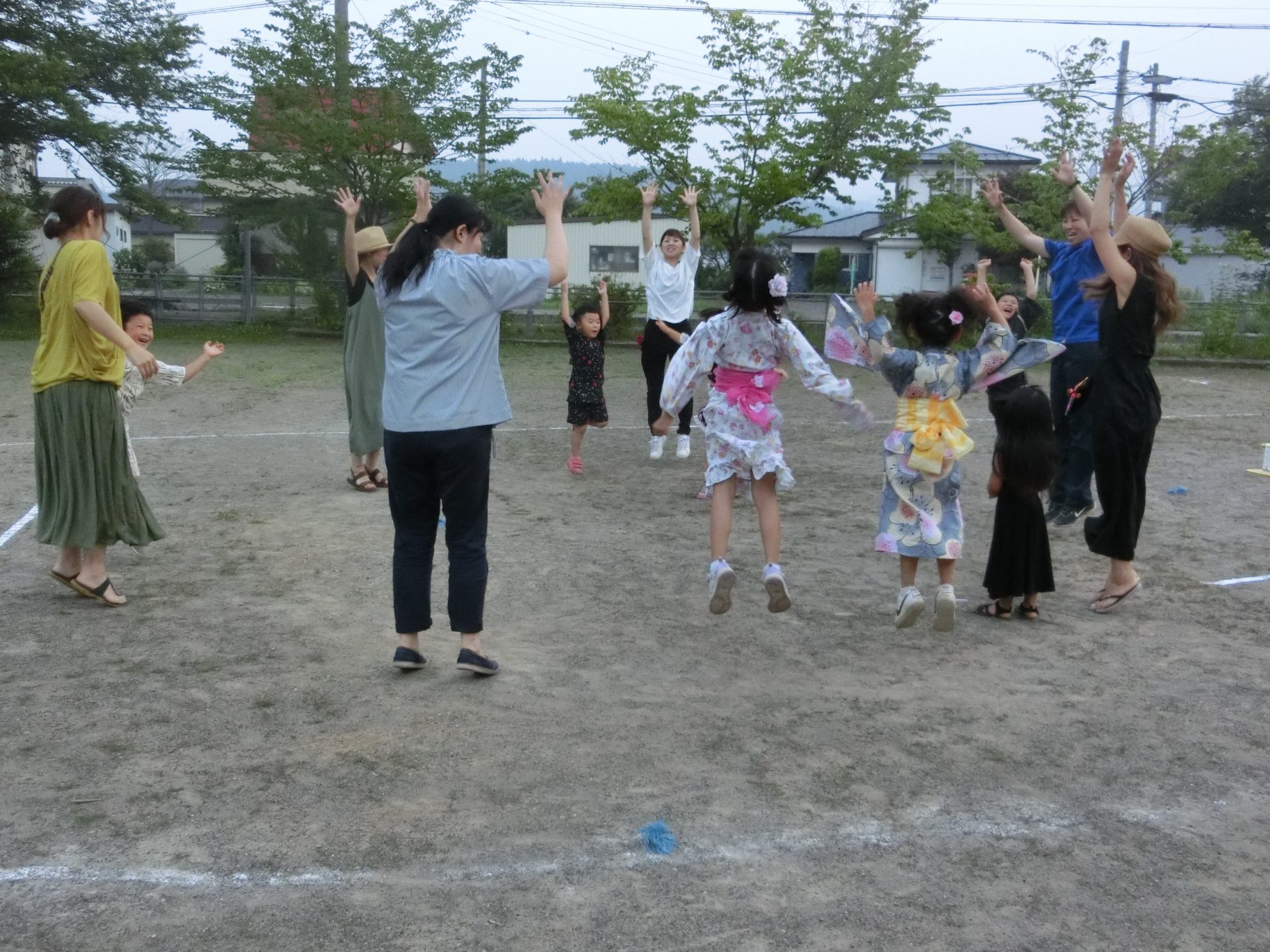 ここからはお家の人が来てくれて一緒に楽しむ時間です。まずは忍たま音頭。去年の年長さんも踊り、運動会でも踊ったのでみんな大好き!満場一致でこの曲に決まりました。帰りの会の前に毎日のように踊っているので動きは完璧です!