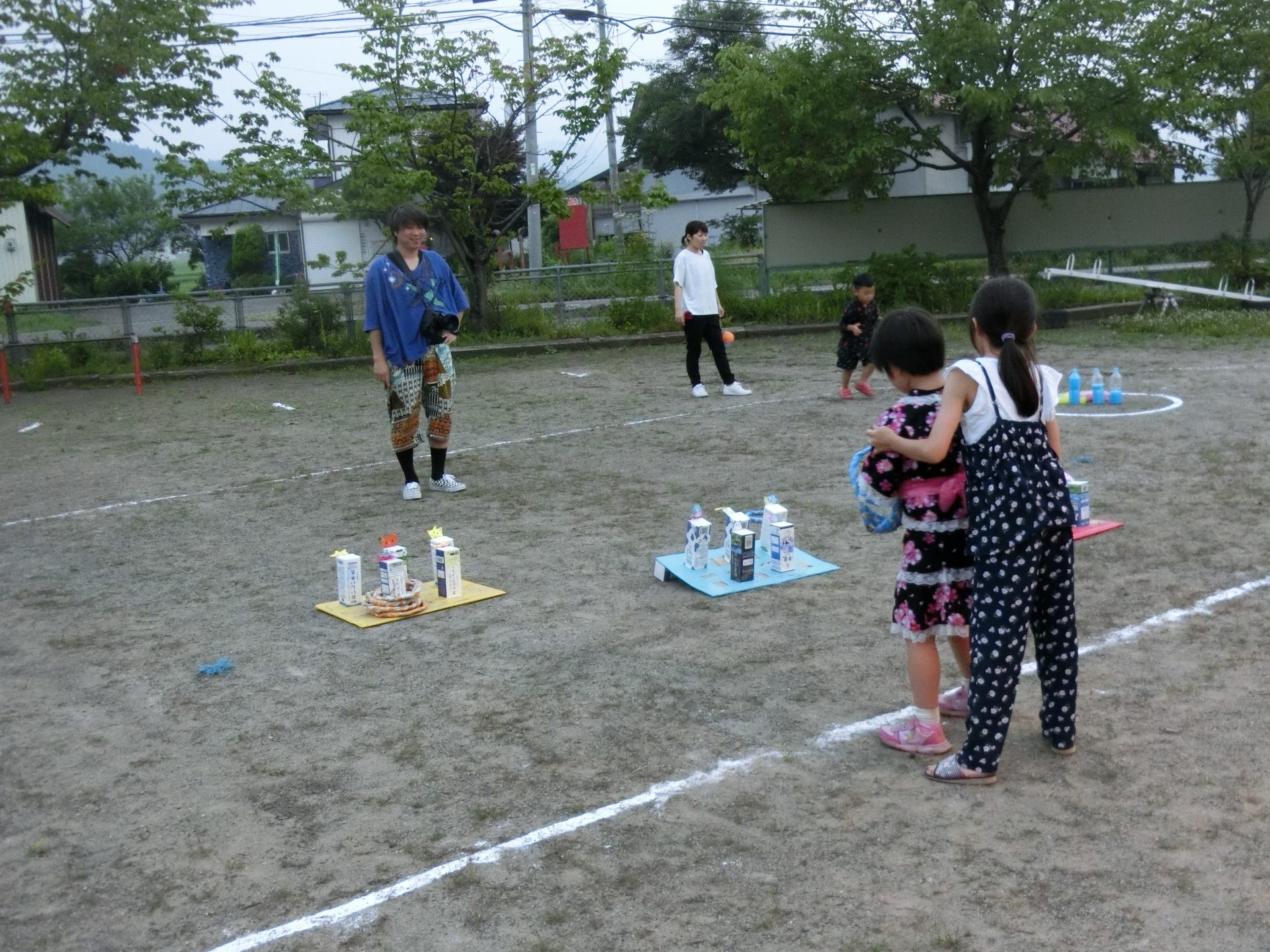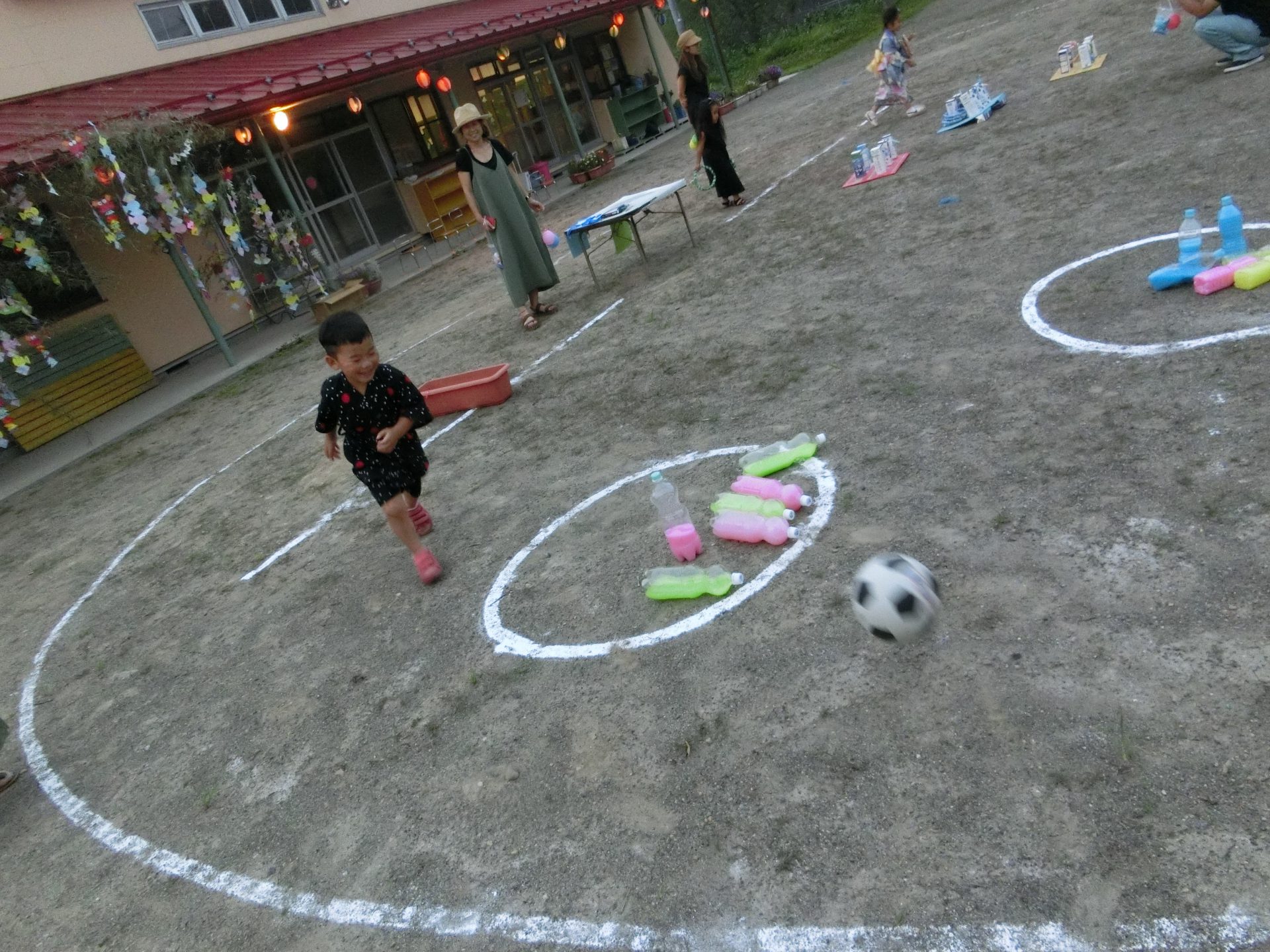 ボーリングのピンも自分たちで作りました。色水は笹飾りに使った染紙の物です。水の量を決めるとき、「少ない方が倒れる!」「いっぱいの方が倒れる!」と意見が分かれたので、自由に入れようということになりました。実際に倒してみて調節し、当日に備えました。わざと難しくする姿もあり、少し難しい方が楽しい!と挑戦する楽しさを知っている証拠だなと思い、嬉しかったです。