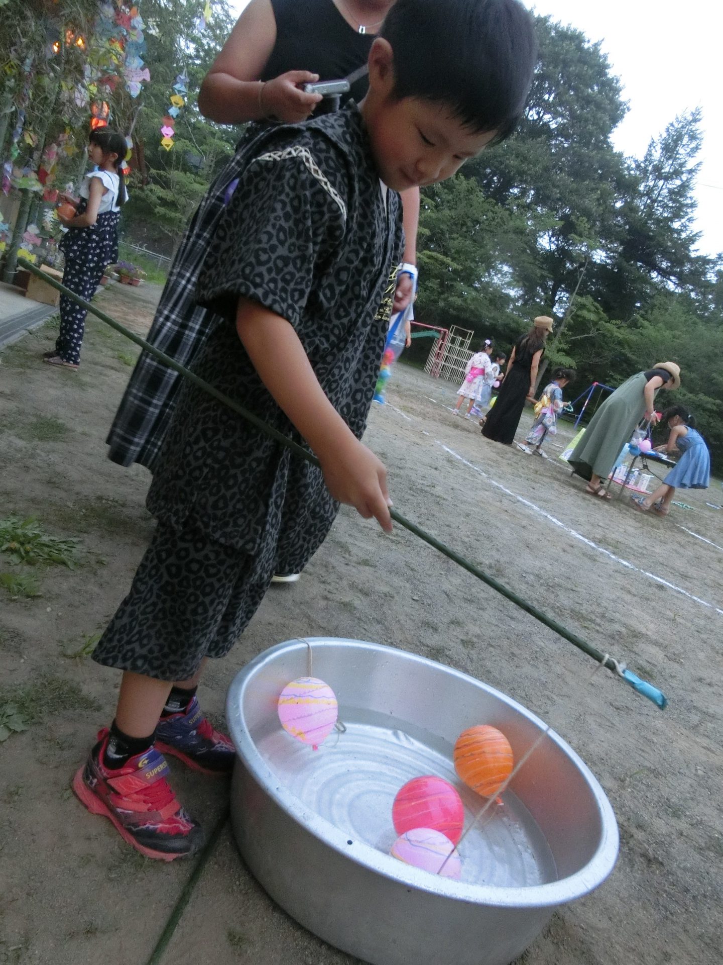 次はおまつり、コーナー遊び。園庭に作られたコーナーでお家の人とたくさん遊びました。お家の人の手を引いて「こっち!こっち!」と笑顔の子ども達。とても嬉しそうでした。同じコーナーで繰り返し遊び、やり方を極めようとしている子もいました。