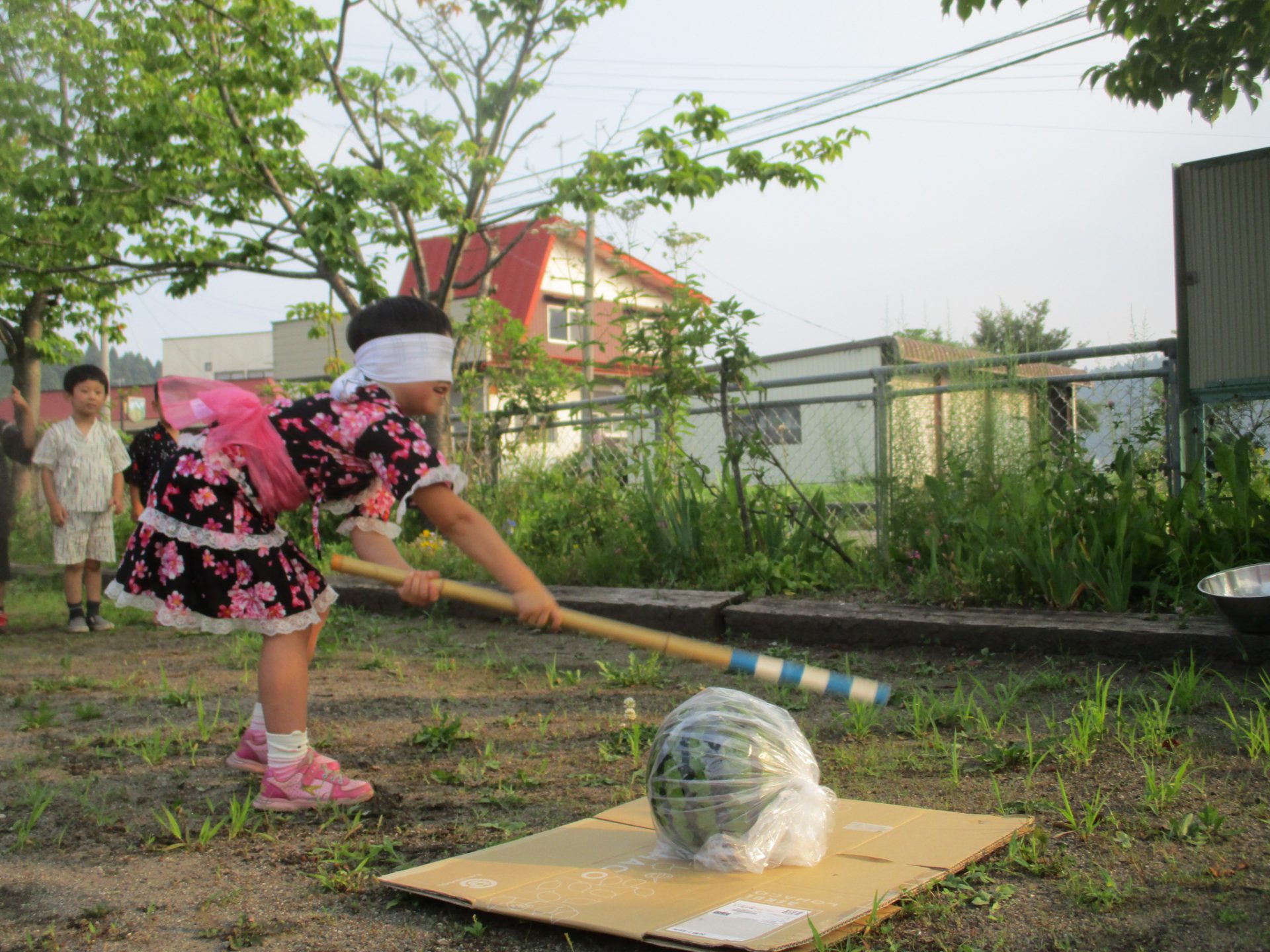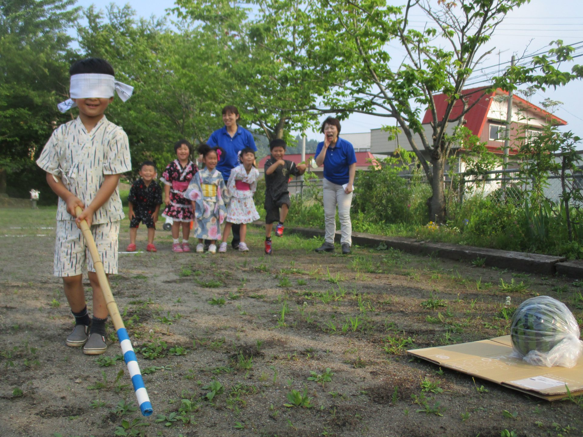 最初はすいかわり!「やったことあるー!」「はじめてー!」と大きなすいかを見て大喜びのみんな。暑いので木陰でやろう、と場所は決めましたが、スタート地点は子ども達で相談です。「ここがいい!」と園庭の一番端へ行くお友達。「でも目隠しするんだよ!」「遠すぎるよ、危ないよ。」と言われしばらく考え、「そうか…。」と前へ出ました。