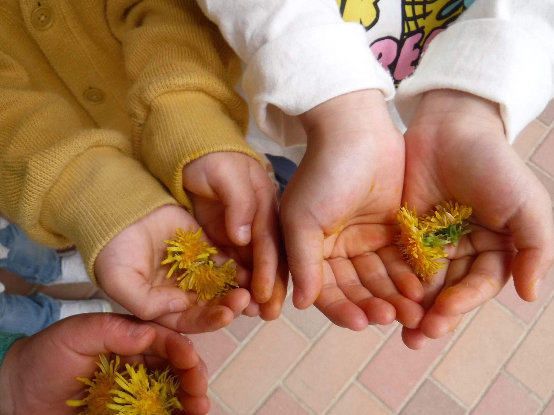 こども園にはたんぽぽがたくさん咲いていて、たんぽぽを摘んだら「手が黄色になったよ!!」と
