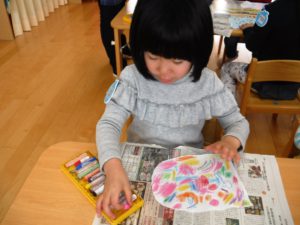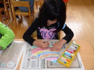 そこにみんなそれぞれのうろこをクレヨンで模様をつけて、、、