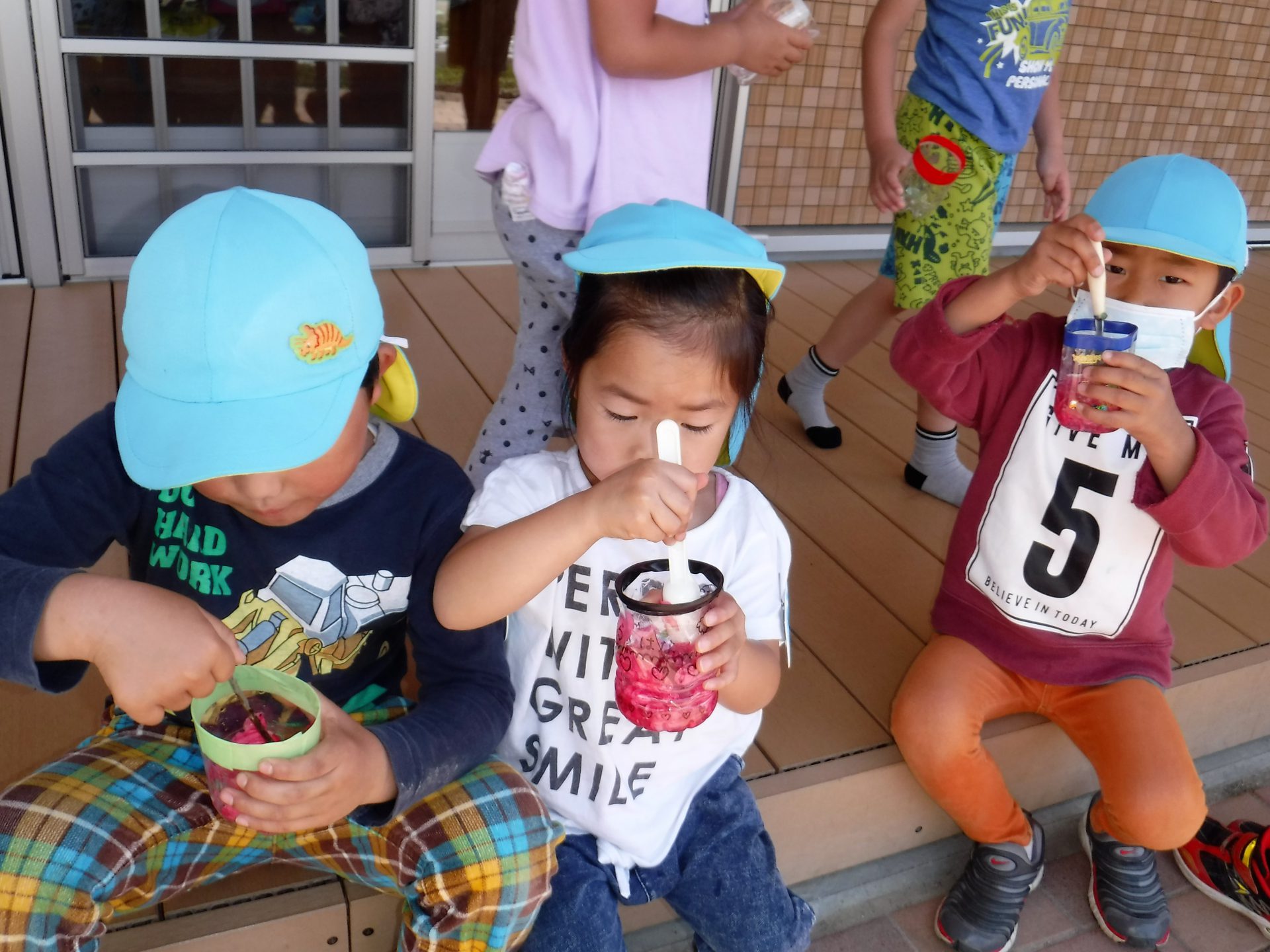 ・こいのぼり作りをとおして、自然の中であそぶ事の楽しさ、匂いや色、感触などいろいろな発見をし、面白さを体験しながら、友だち関係を深められた、素敵な1学期の思い出となりました。
