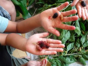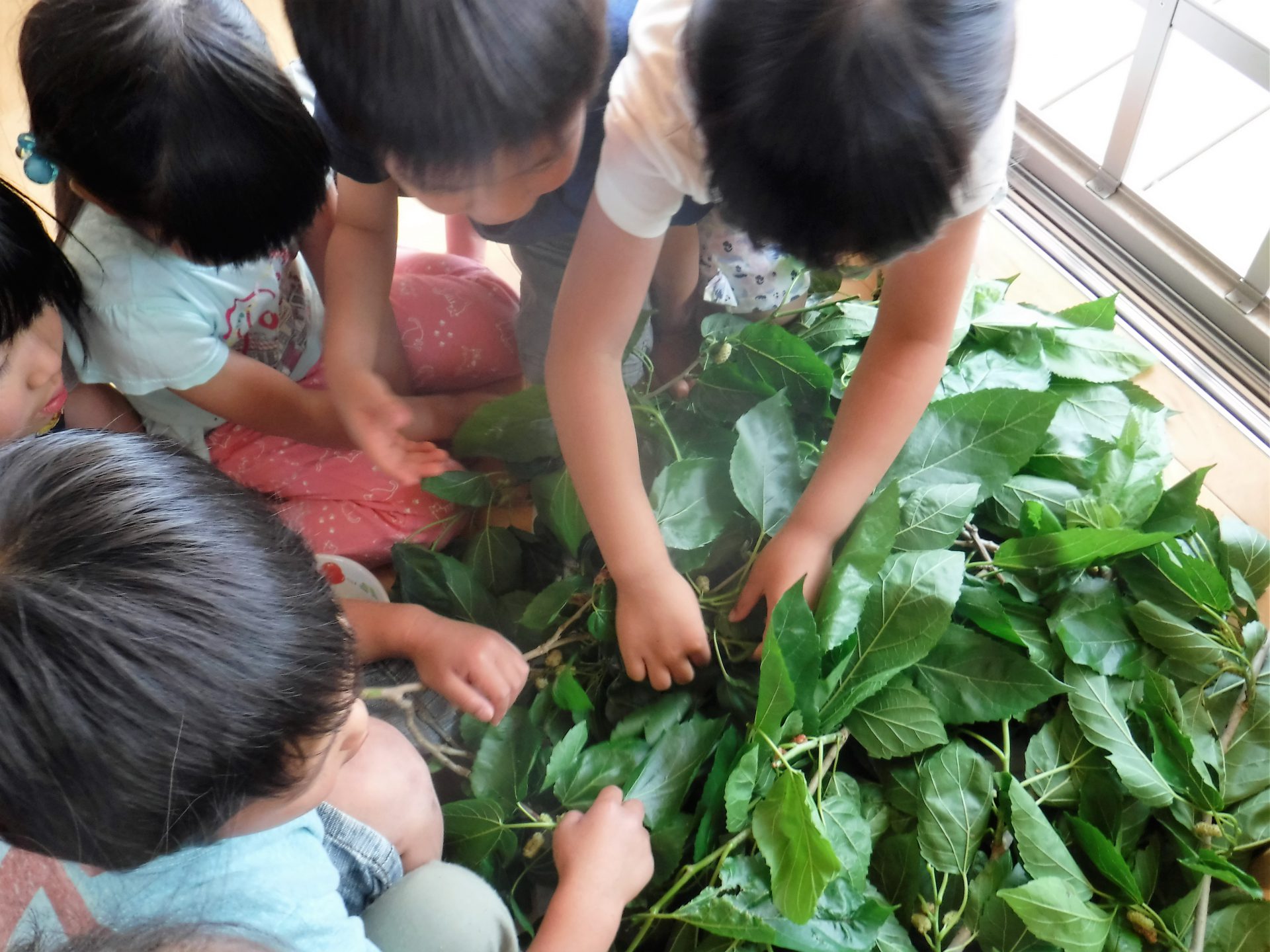 そして今年も蚕を飼育しいている年長さん。蚕のえさをとろうと桑の葉をもってきたら実もついていて