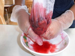 それに触れたら手が赤くなり「また染めものしたい!!」「いろ水つくりたい!!」とこいのぼりの経験から