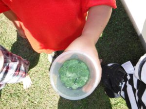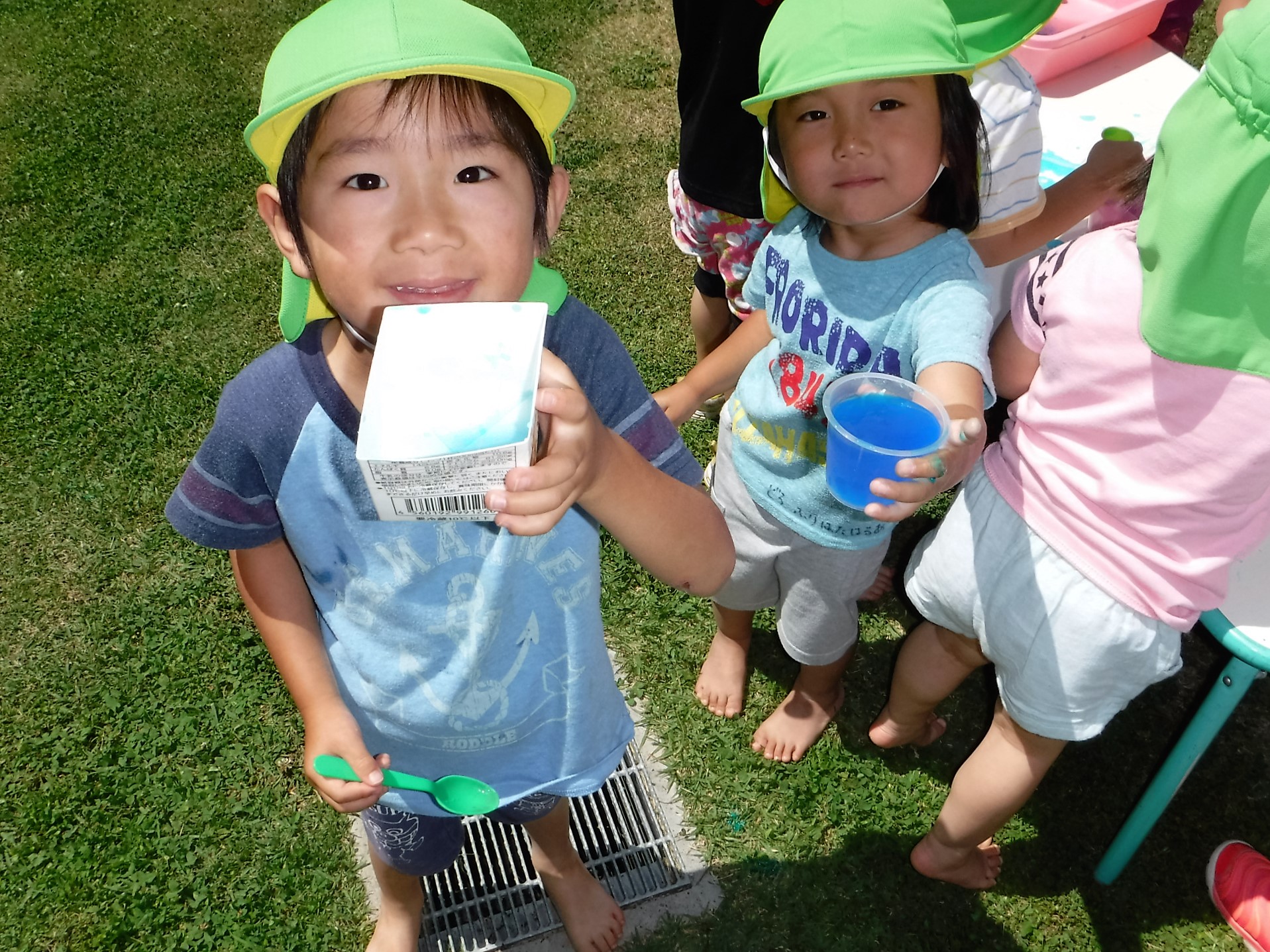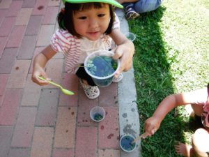 そのうちに、園庭に咲いているたんぽぽやクローバーなど草花を入れて、お友達や先生にオリジナルゼリーを