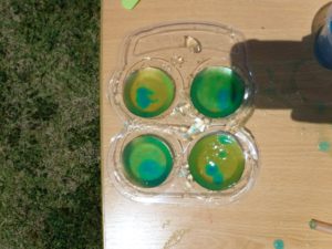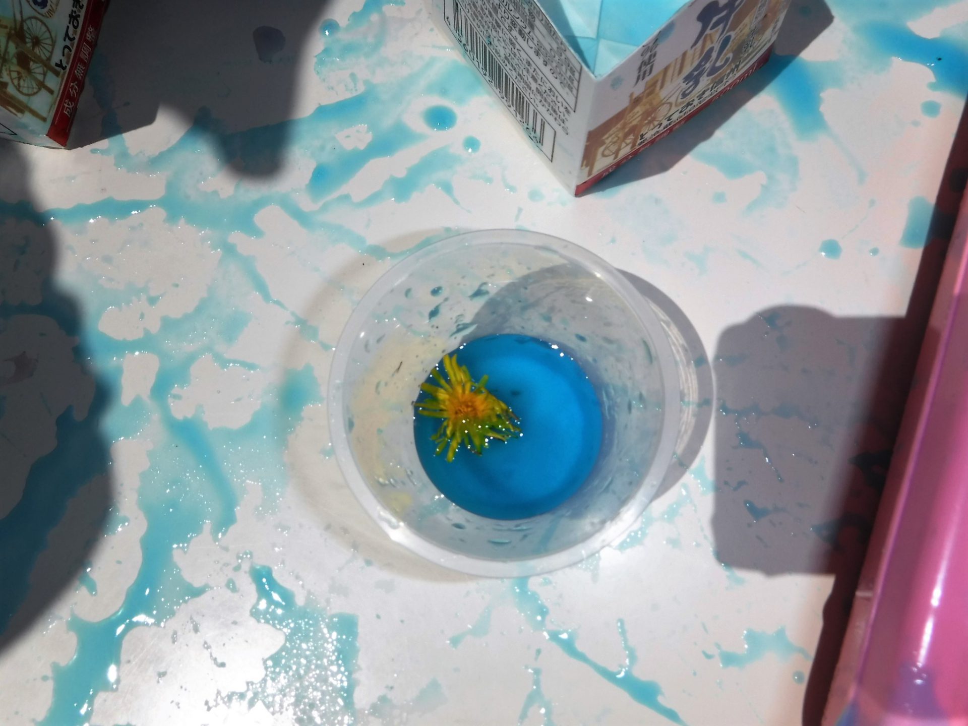 ぽたぽたと違う色をたらしたら模様ができた!キラキラした宝石みたいでしょ?