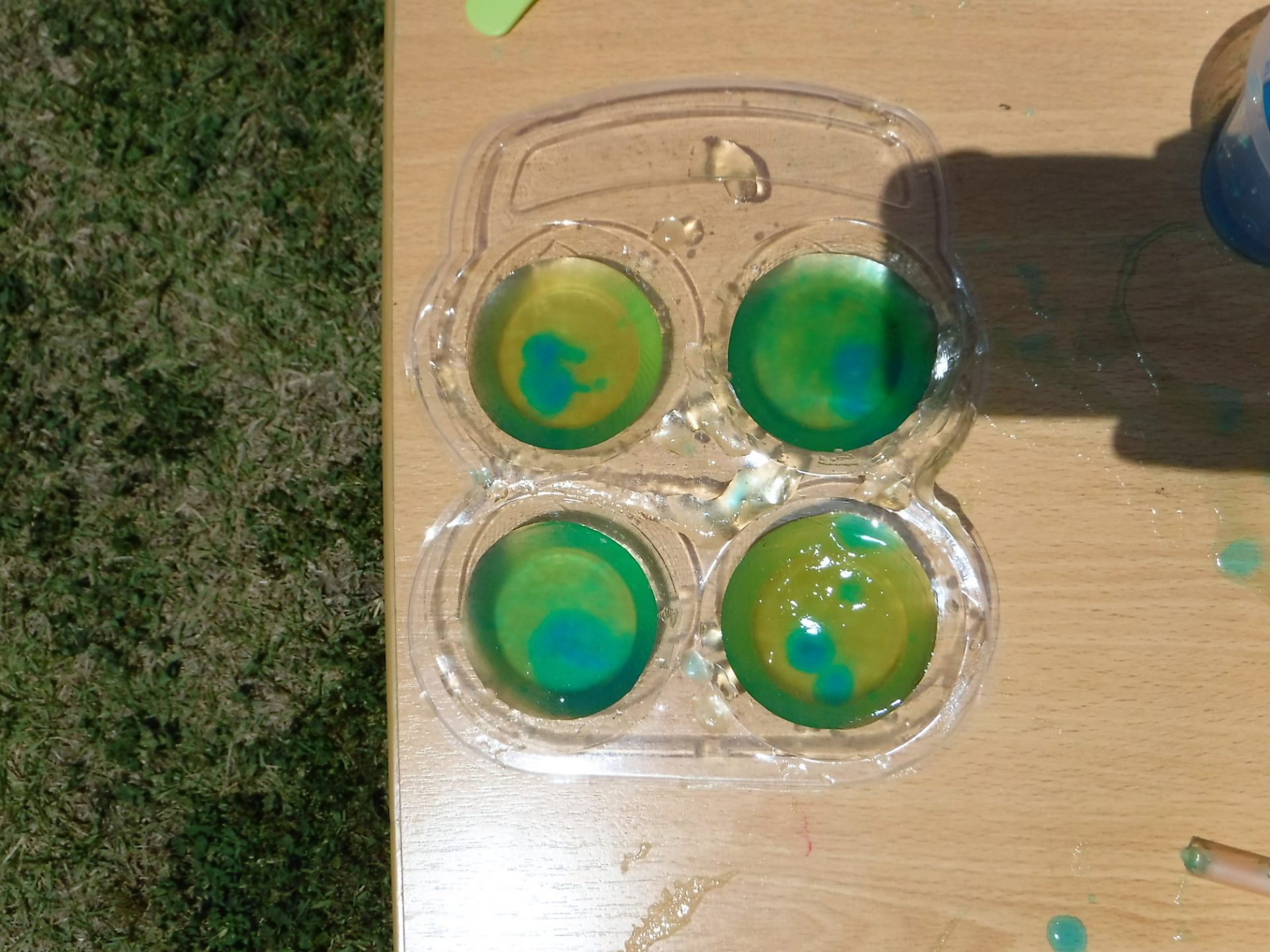 食紅でいろいろな色のゼリーを作り、寒天遊びをしました!!