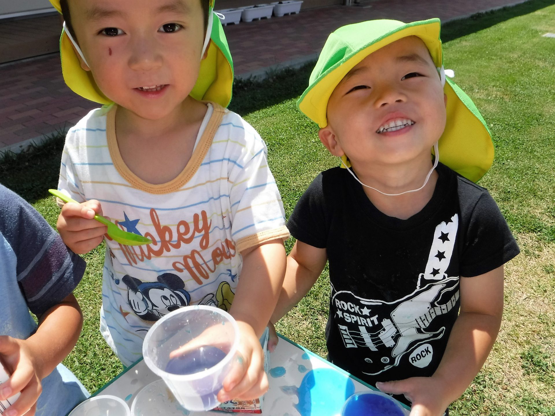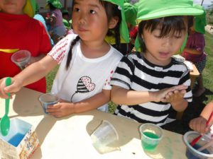 カップにいろいろな色を混ぜている子ども達。どんな色になったかな?