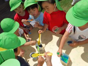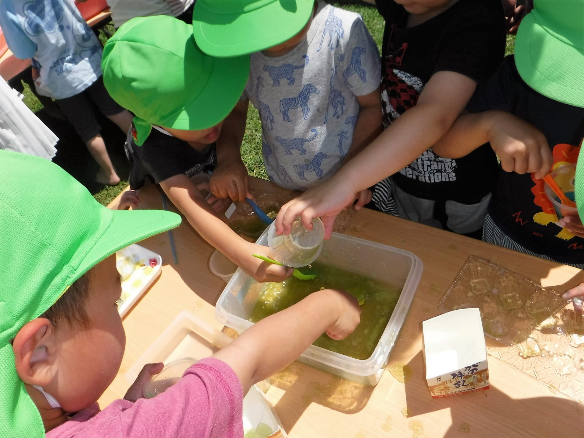 ・寒天ゼリーに、草花や小石、木の実などの自然物を使ってオリジナルゼリーを作るなど、子ども達一人一人が自由な発想の中で遊びを楽んでいた。