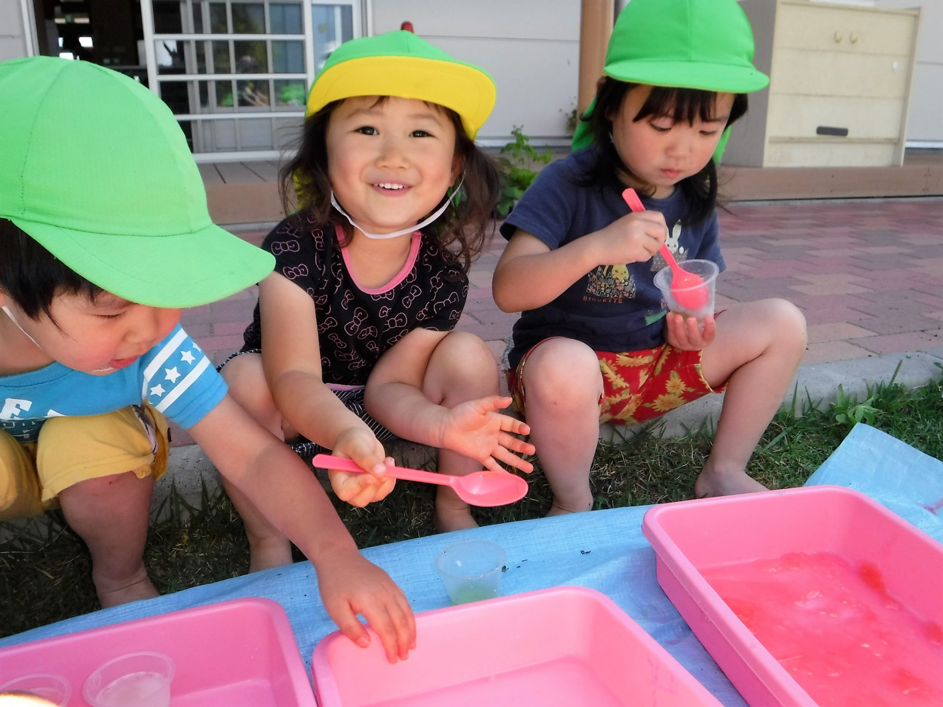 ・園庭に咲いている草花をゼリーに入れて楽しむなど、自分たちで工夫する姿も出てきた。
