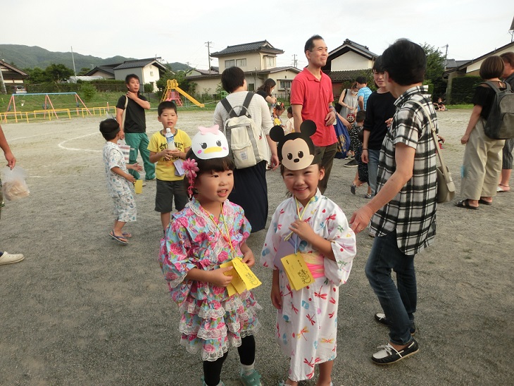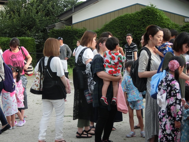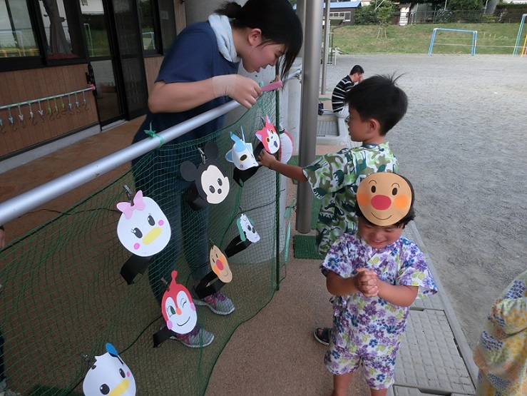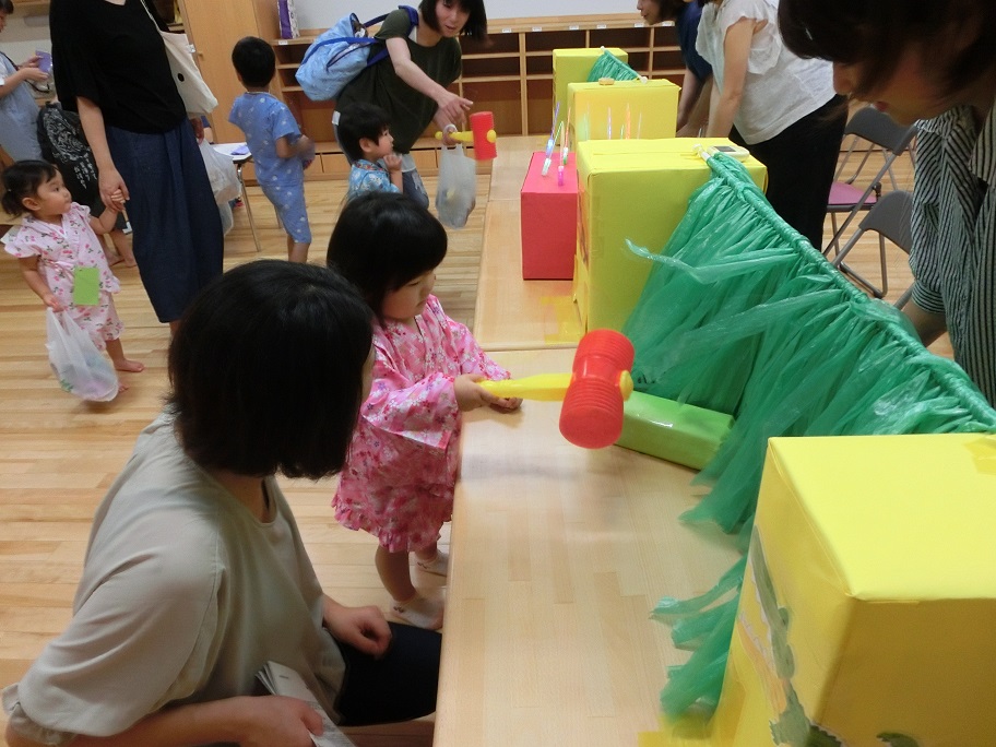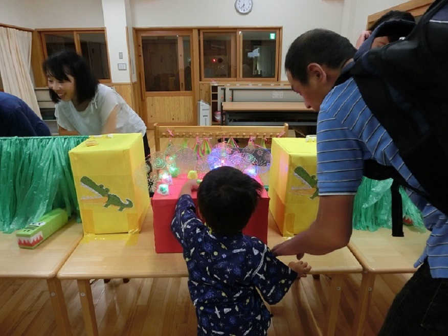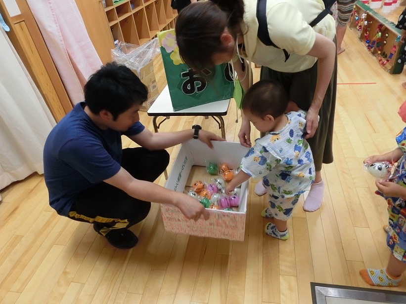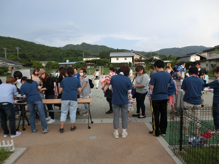 東みのわ保育園では夏祭りを行いました。集合時間になり親子で受付をします。