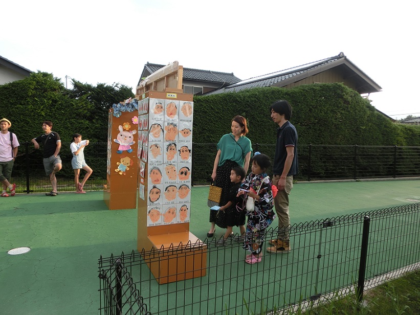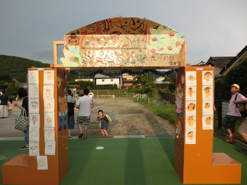 夏祭りのアーチです。アーチの壁には未満児の手形と3歳以上児の自分の顔が貼ってあります。