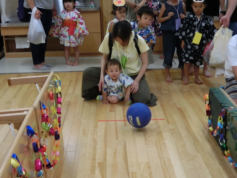 1歳児もお母さんと一緒にボーリングに挑戦しました。