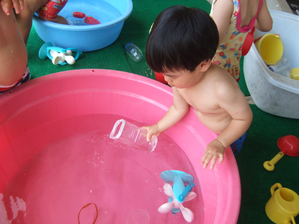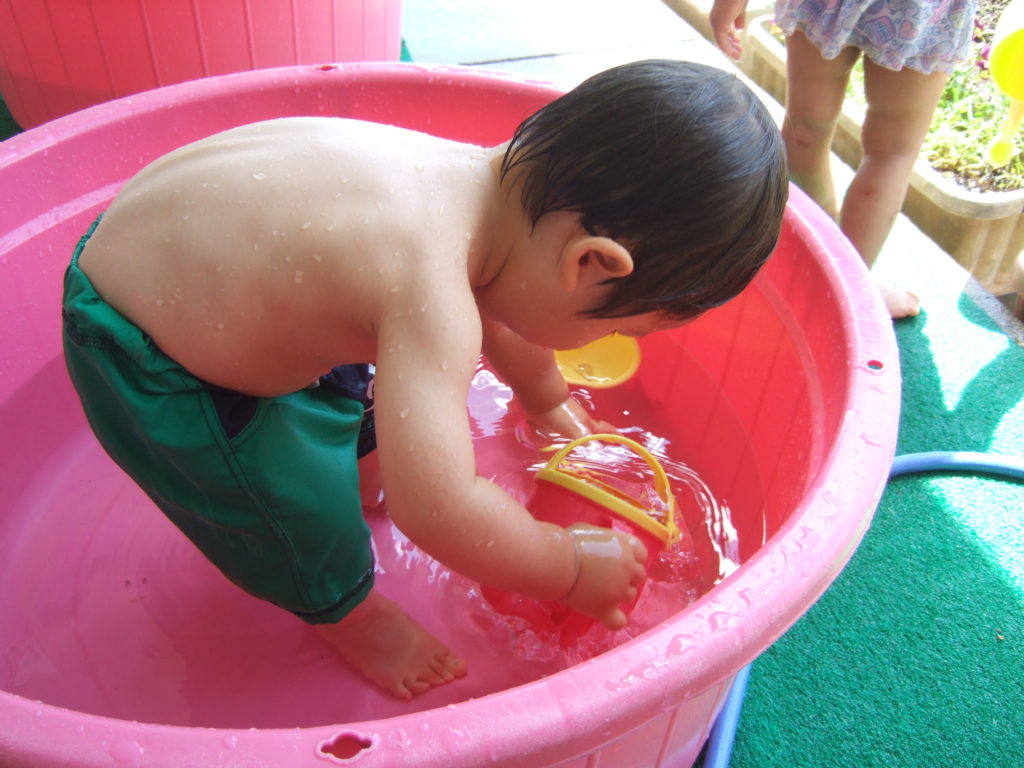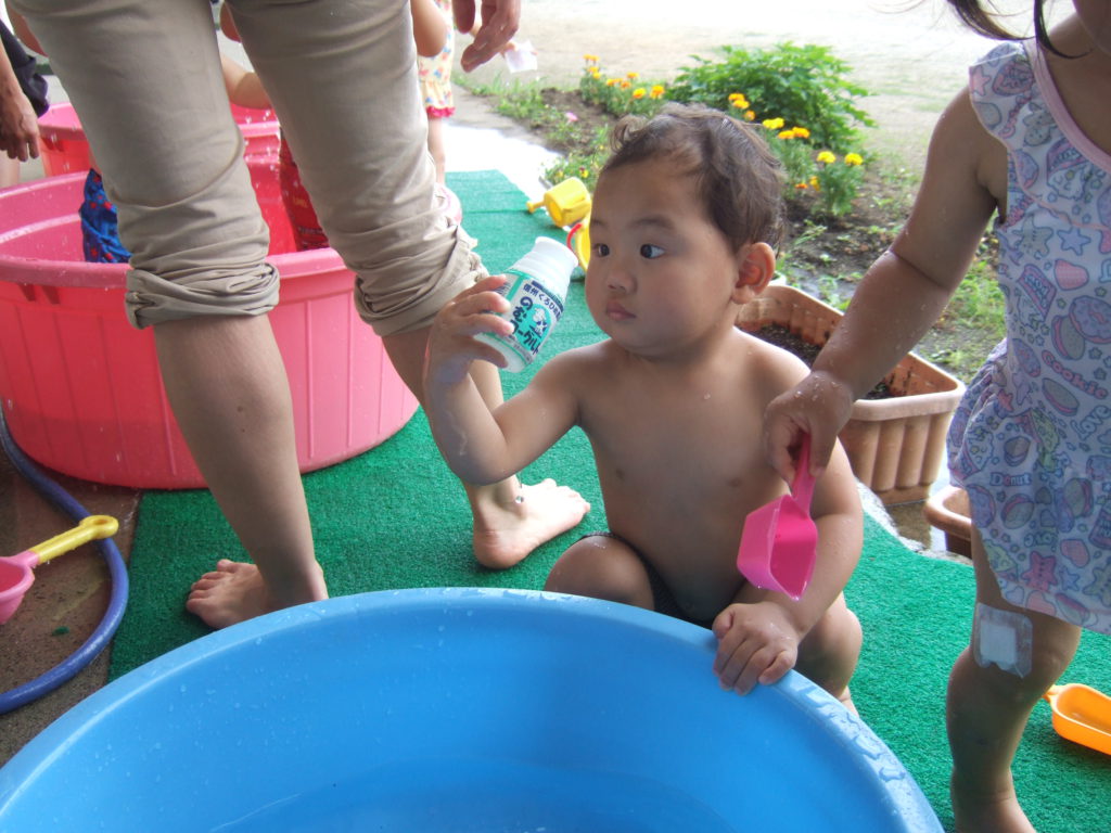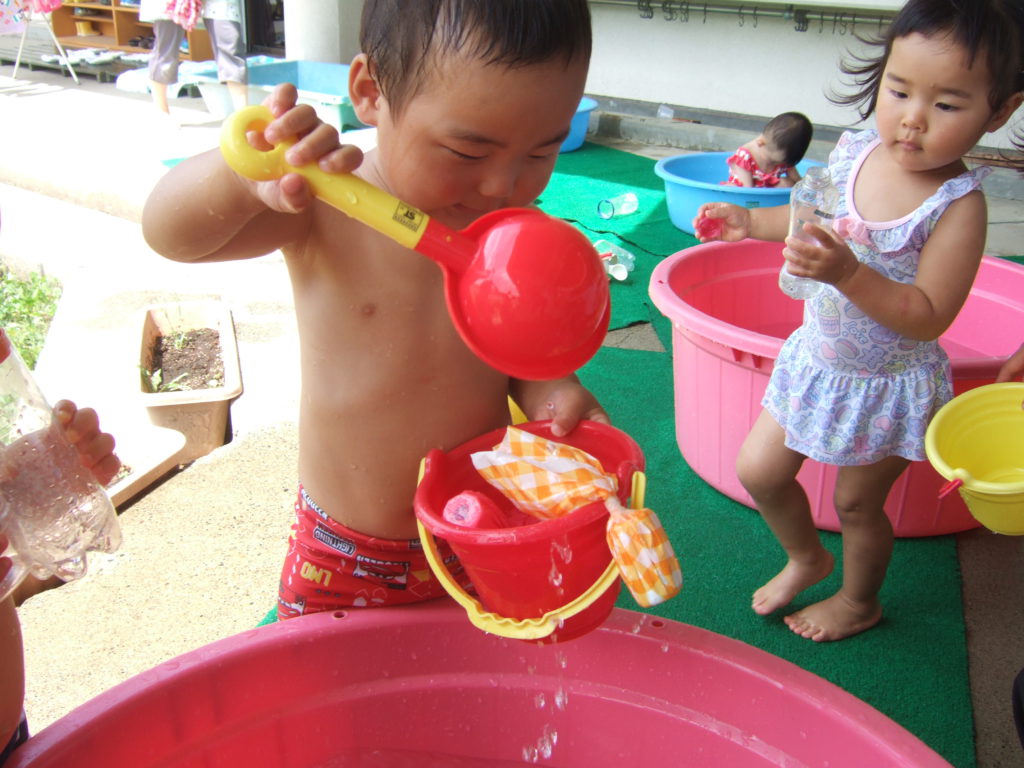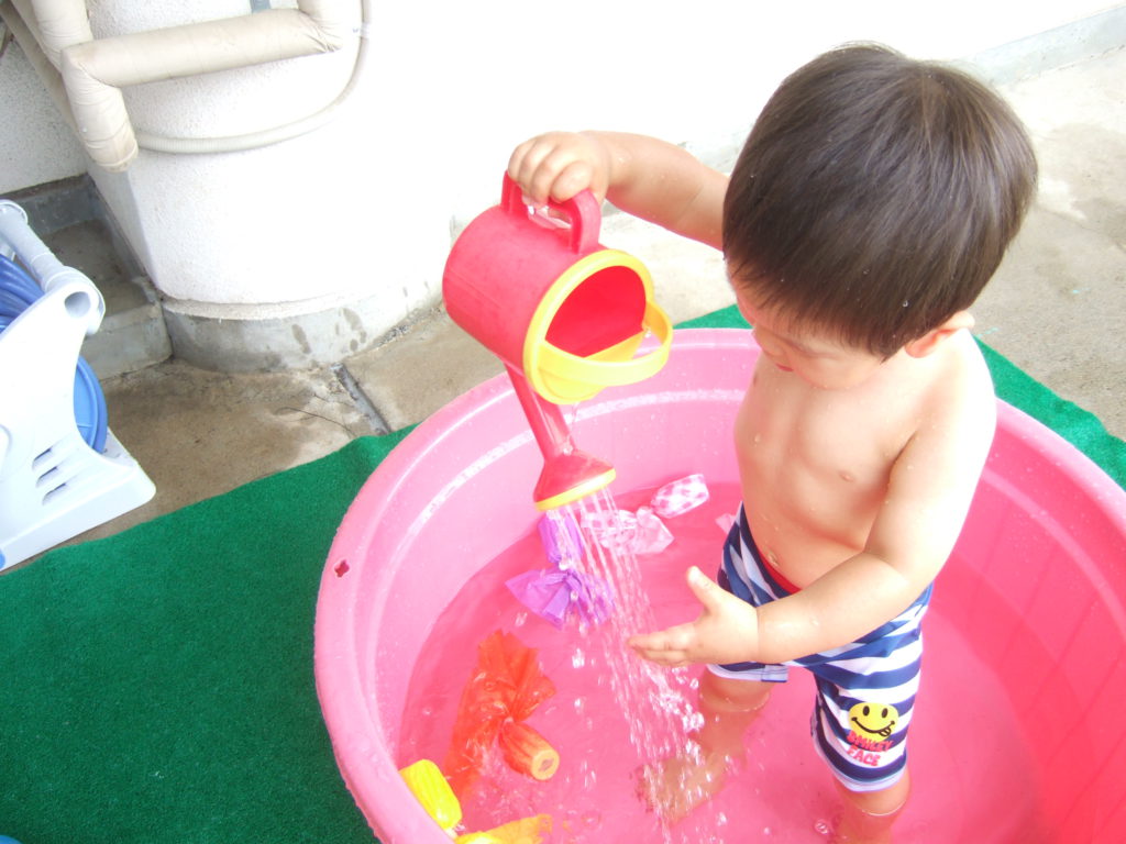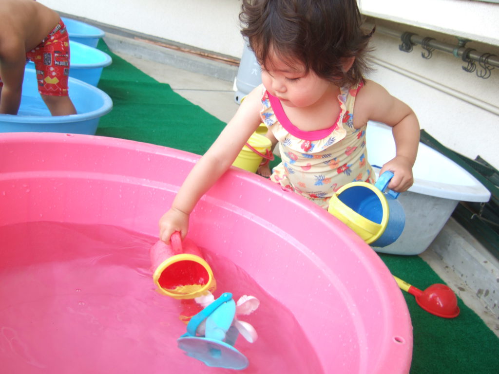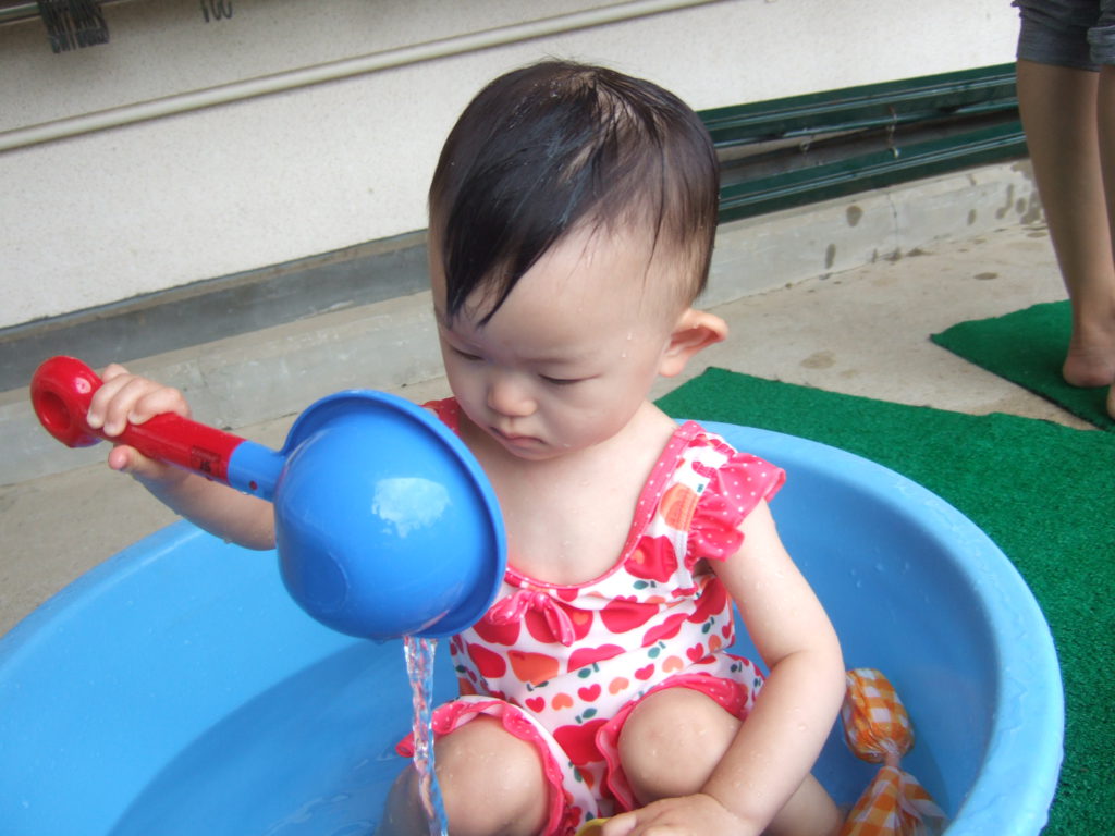 プール遊びの度に何度も何度も何度も、、、、保育士と一緒にたらいから水をくんで遊んでいると、コツをつかんだようです!