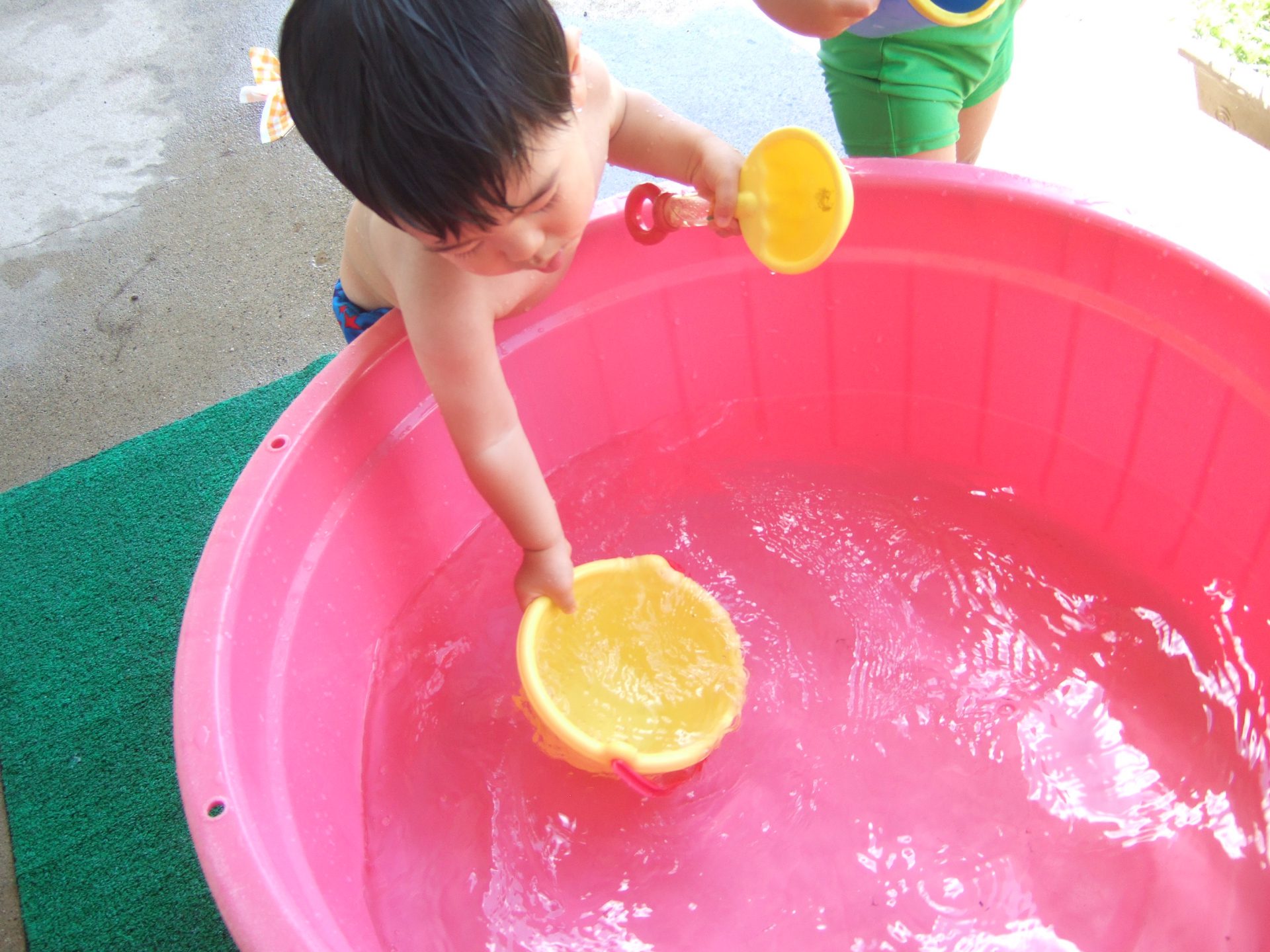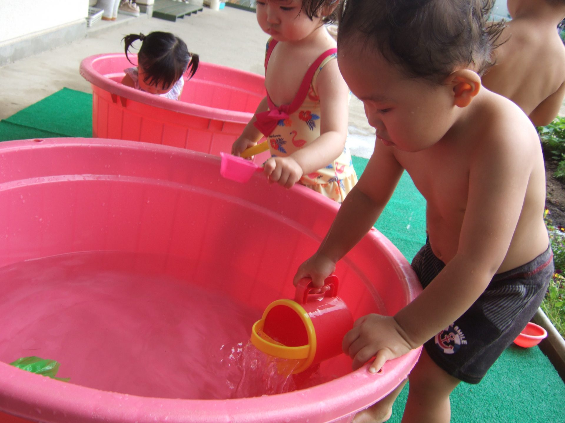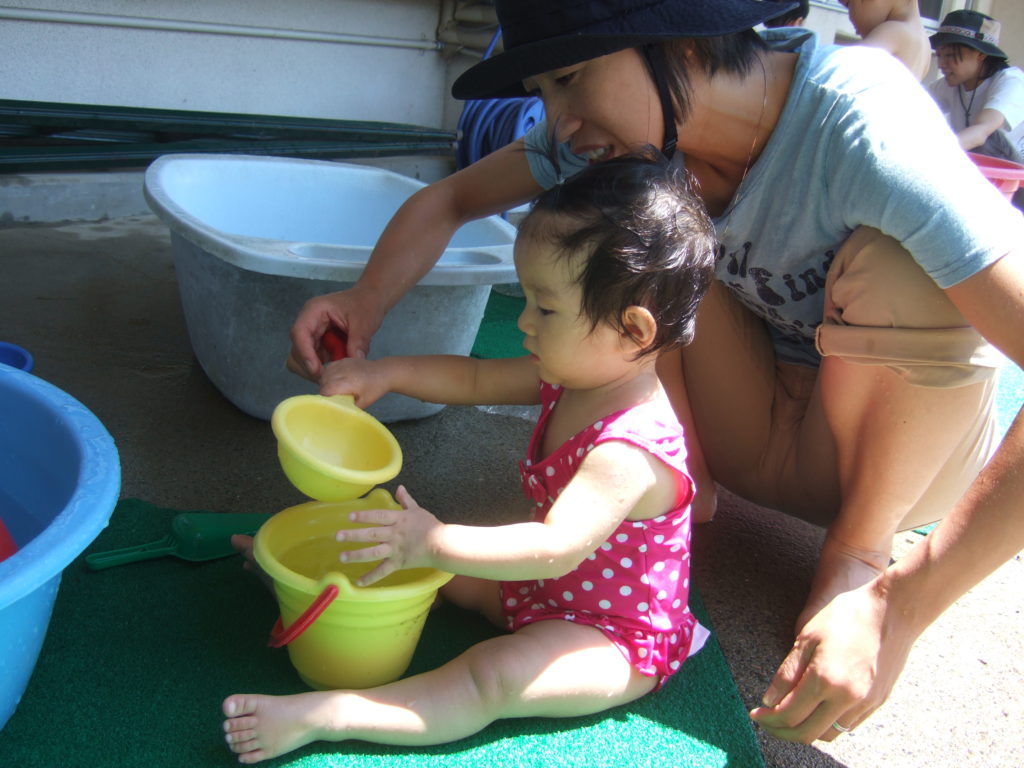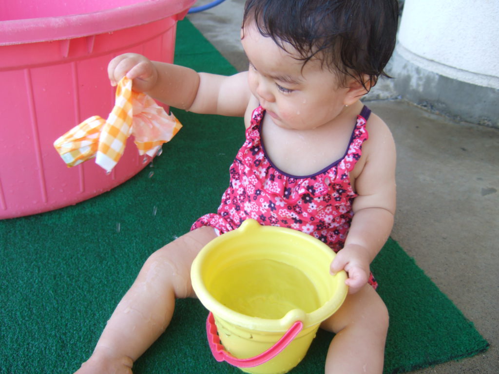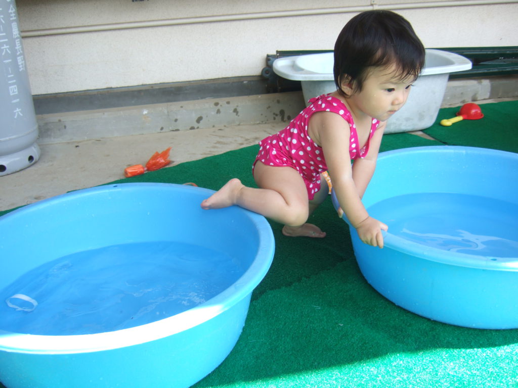 プール遊びの度に何度も何度も何度も、、、、保育士と一緒にたらいから水をくんで遊んでいると、コツをつかんだようです!