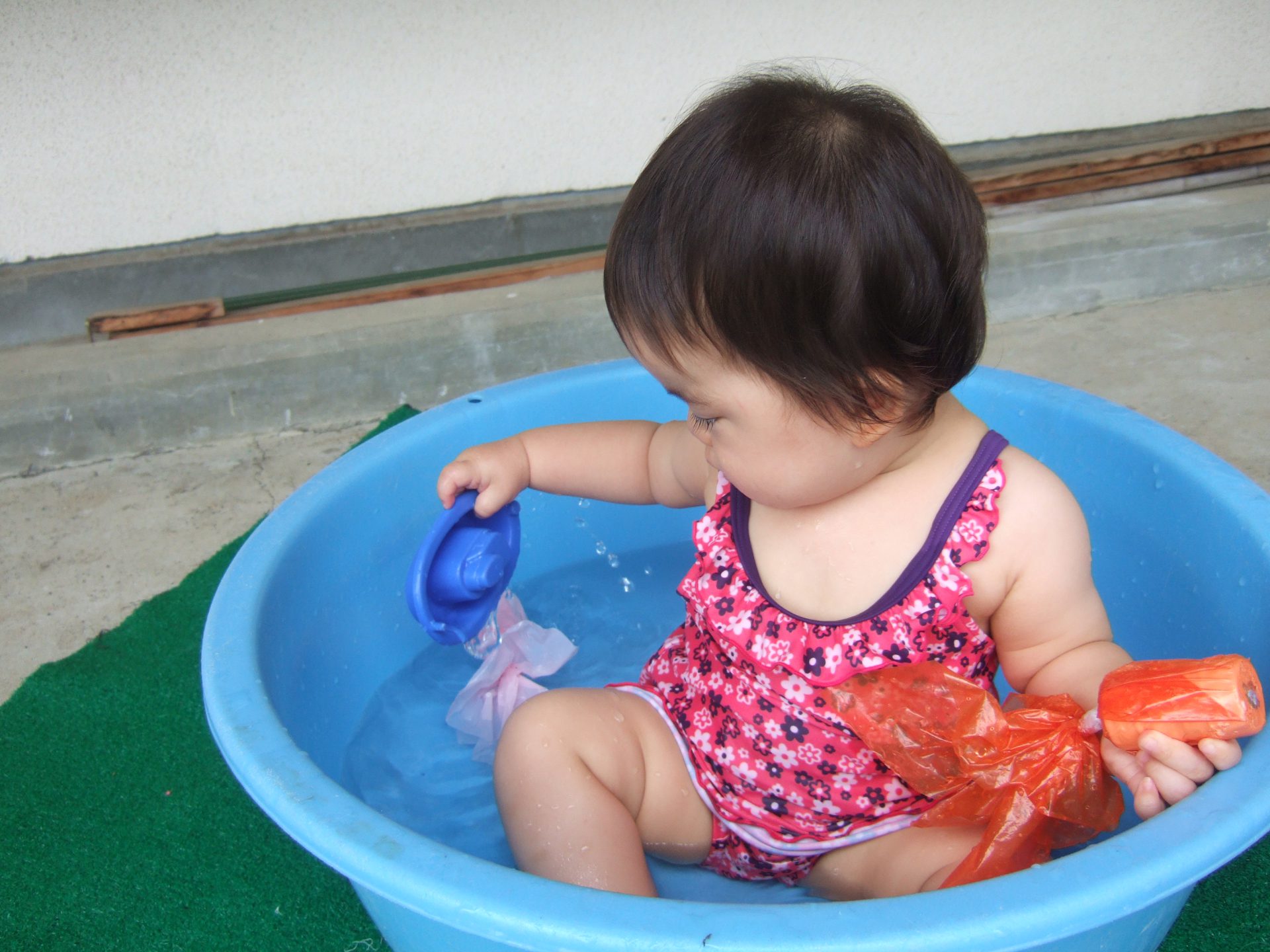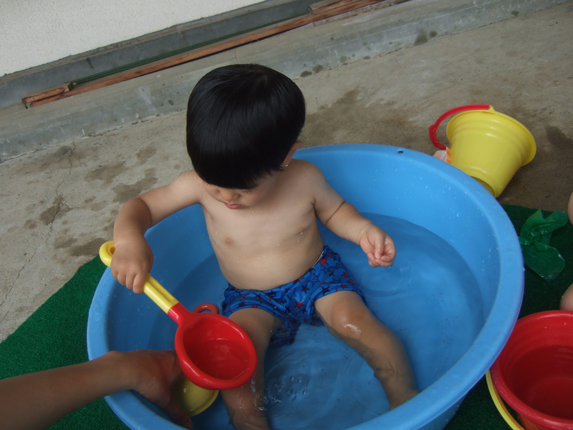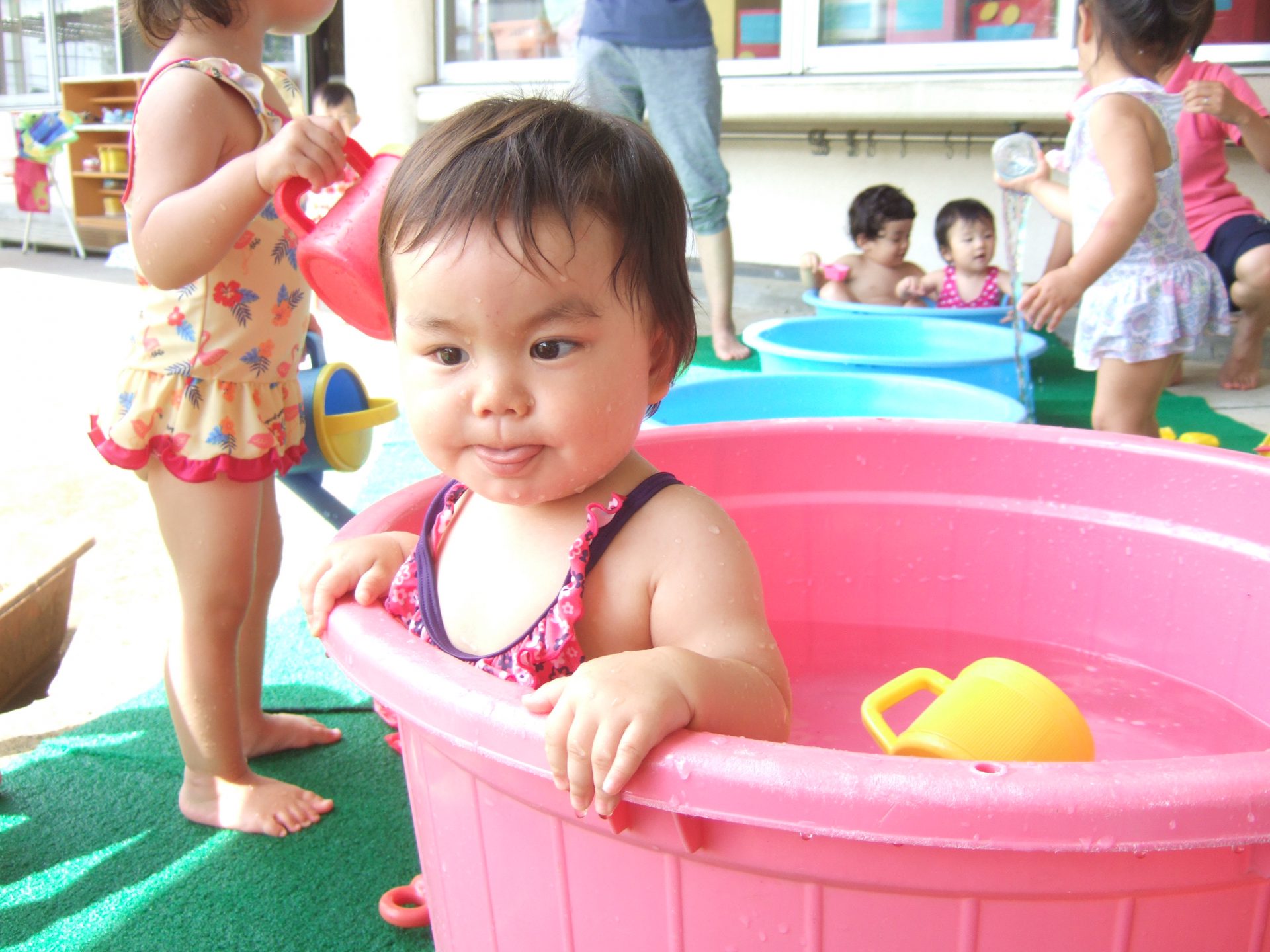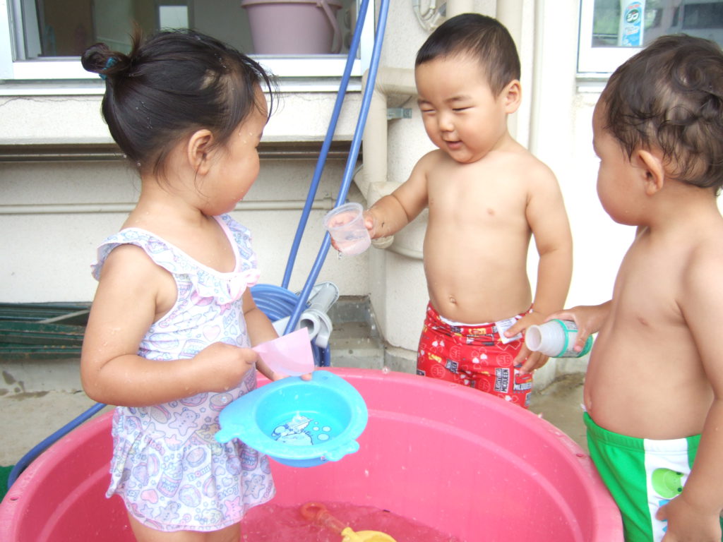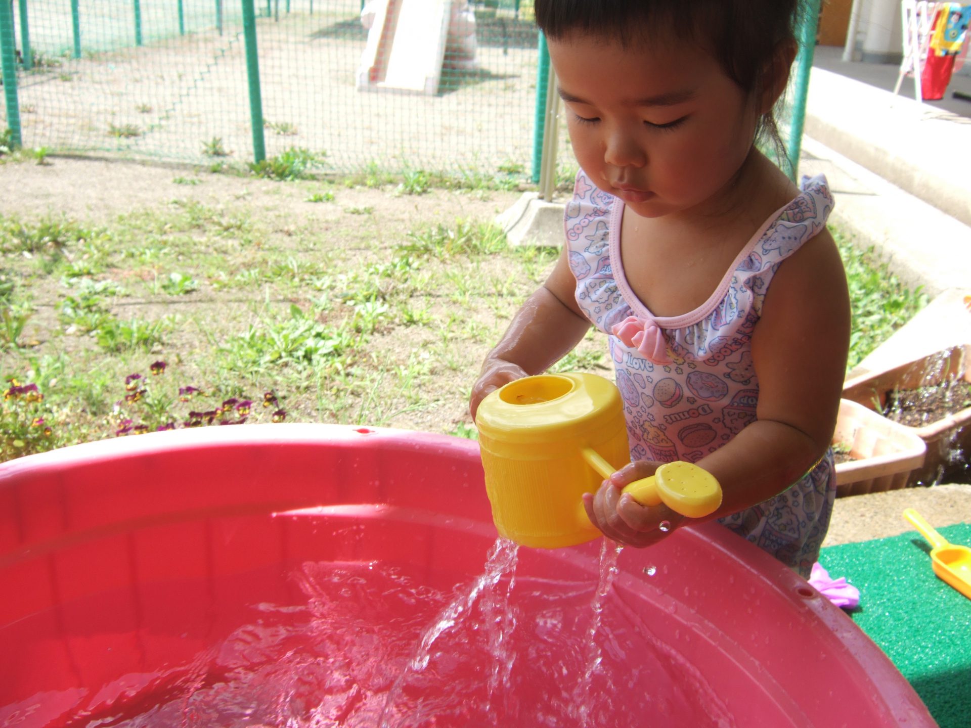 プール遊びの度に何度も何度も何度も、、、、保育士と一緒にたらいから水をくんで遊んでいると、コツをつかんだようです!