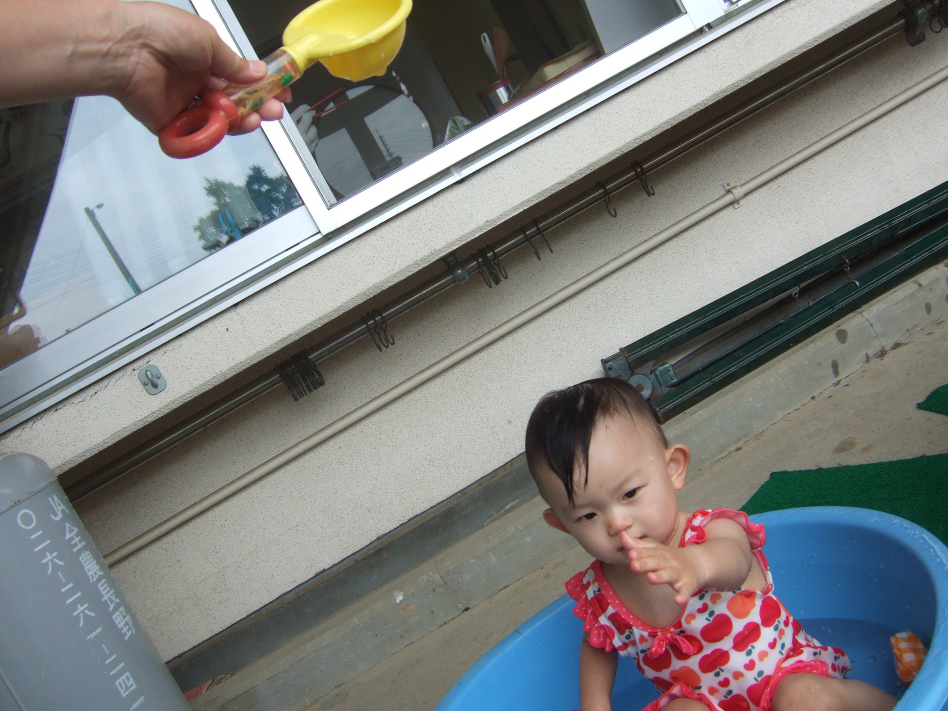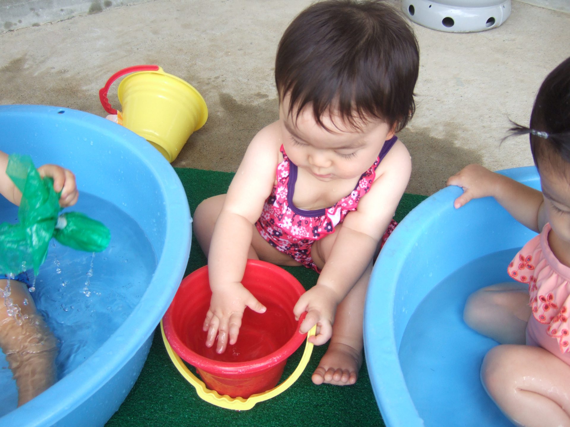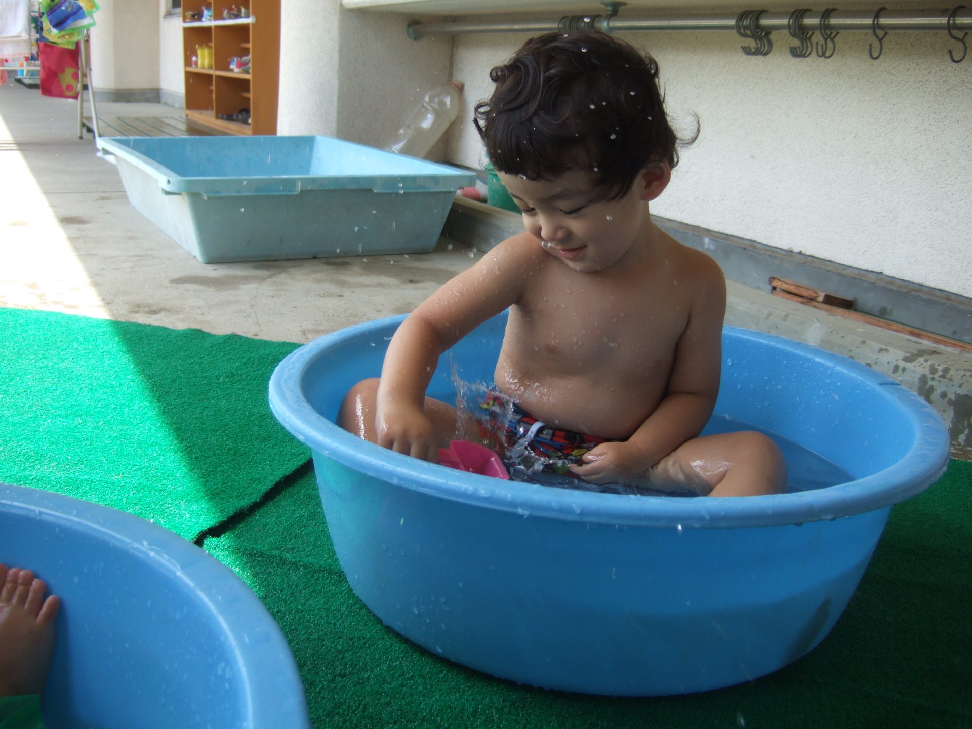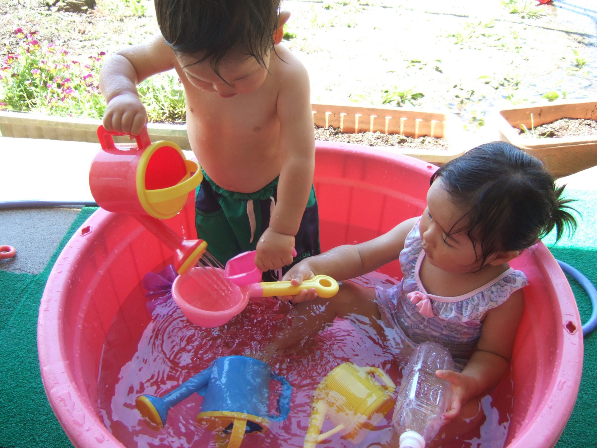 プール遊びの度に何度も何度も何度も、、、、保育士と一緒にたらいから水をくんで遊んでいると、コツをつかんだようです!
