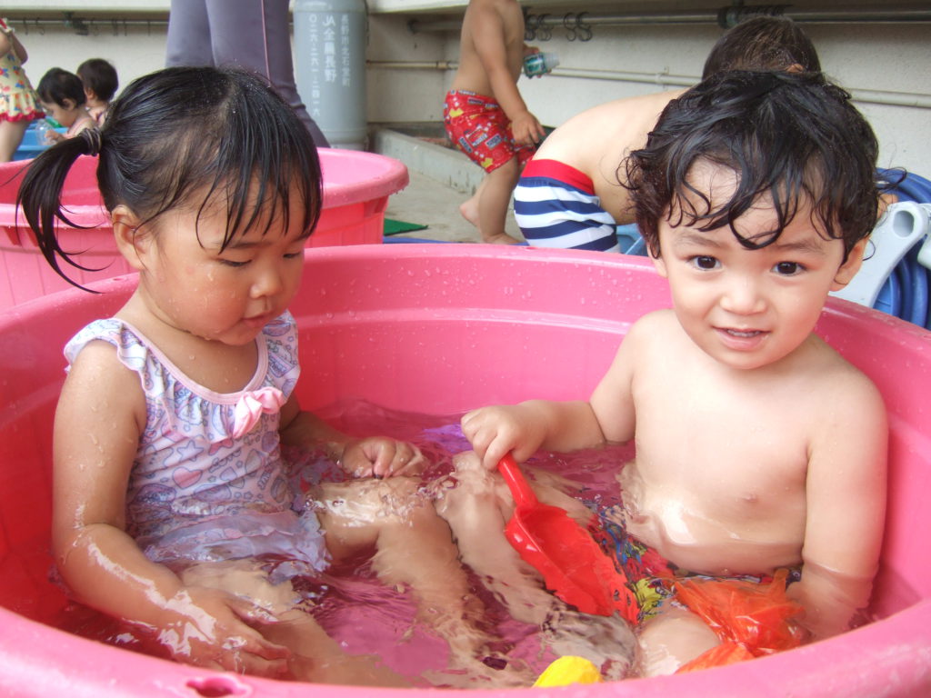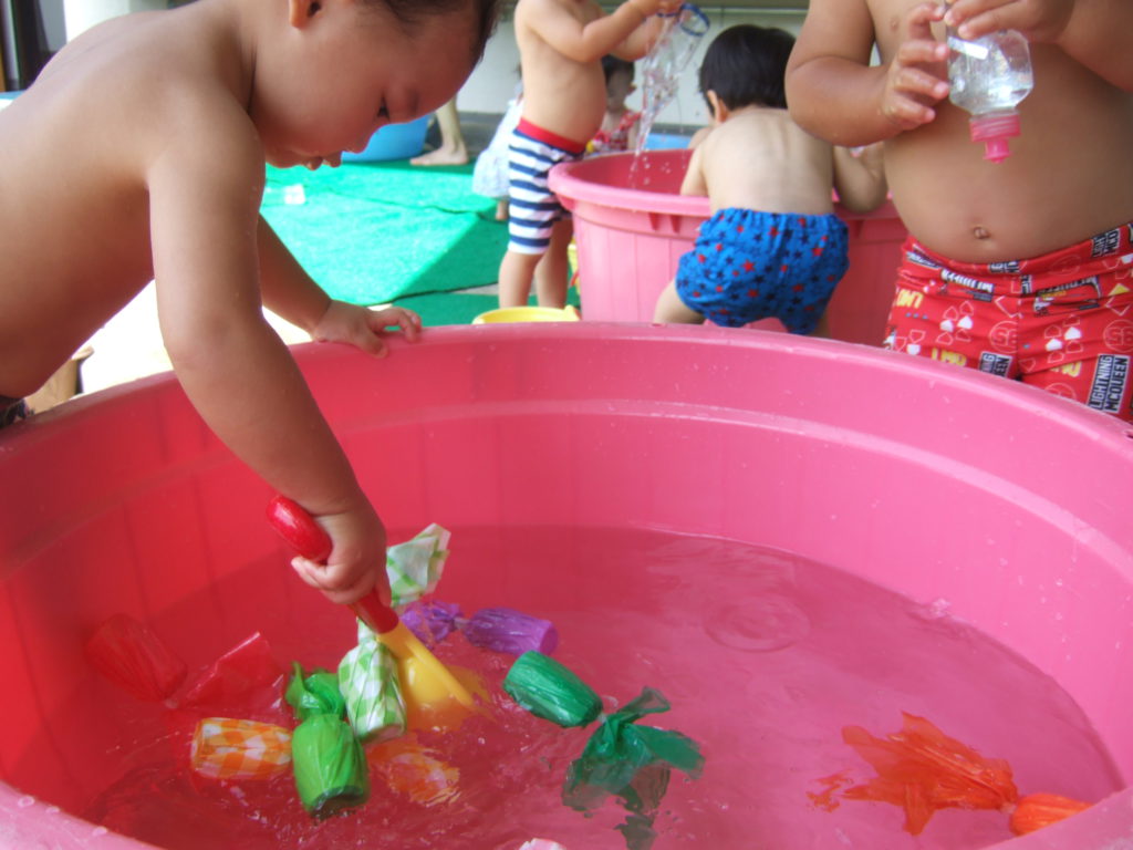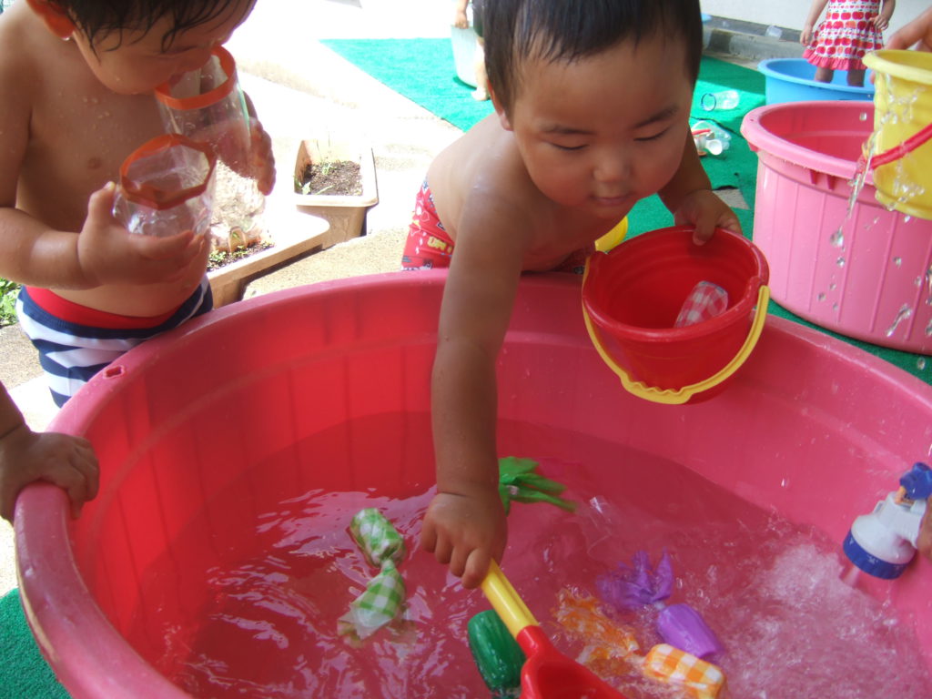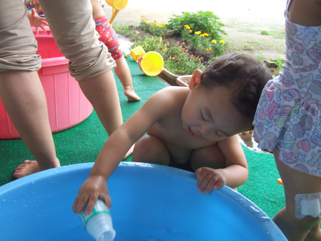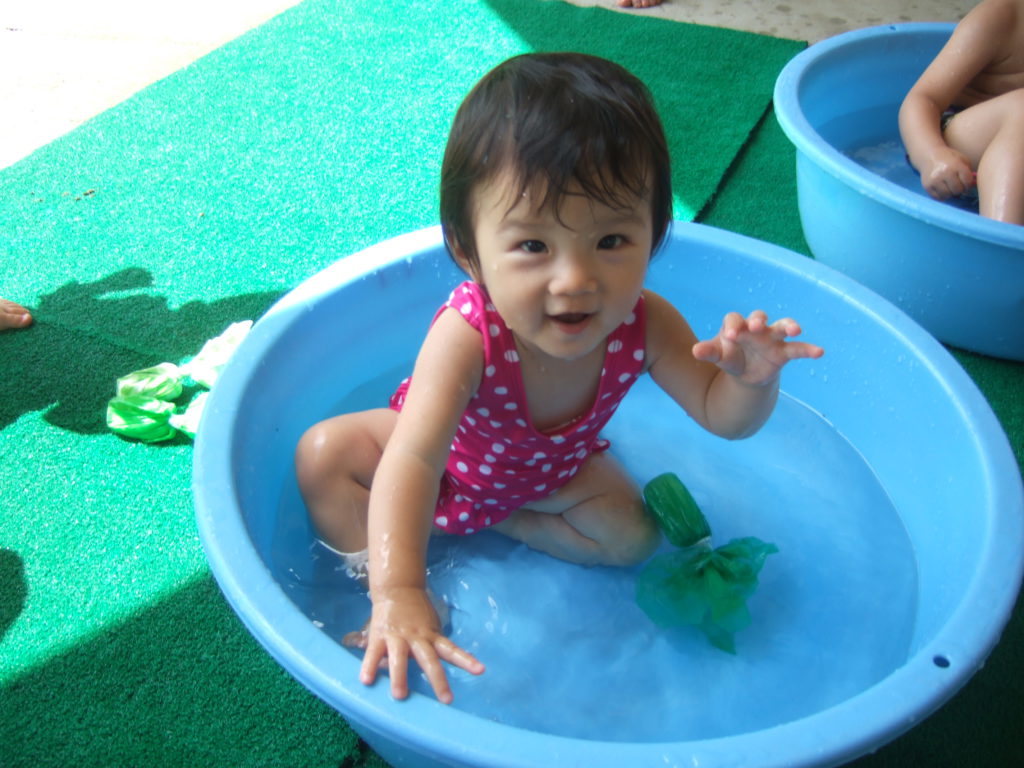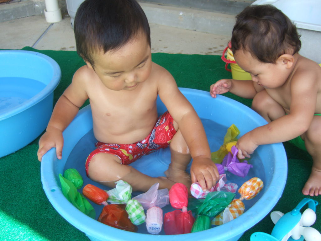 保育園では一番小さなあんず組のお友達ですが、遊びのなかで、いろいろなことに興味を持ち不思議に思ったり、気づいたり、楽しんだり、子供の好奇心ってすごいなと思います。これからも予想される遊びに限らず、子どもの好奇心を大切に遊ぶ姿を見守ったり共感したりしながら子どもの遊びが豊かになるように環境を工夫していきたいと思います。まだまだ夏は長いです!これからどんな遊びを楽しんでいくかな?