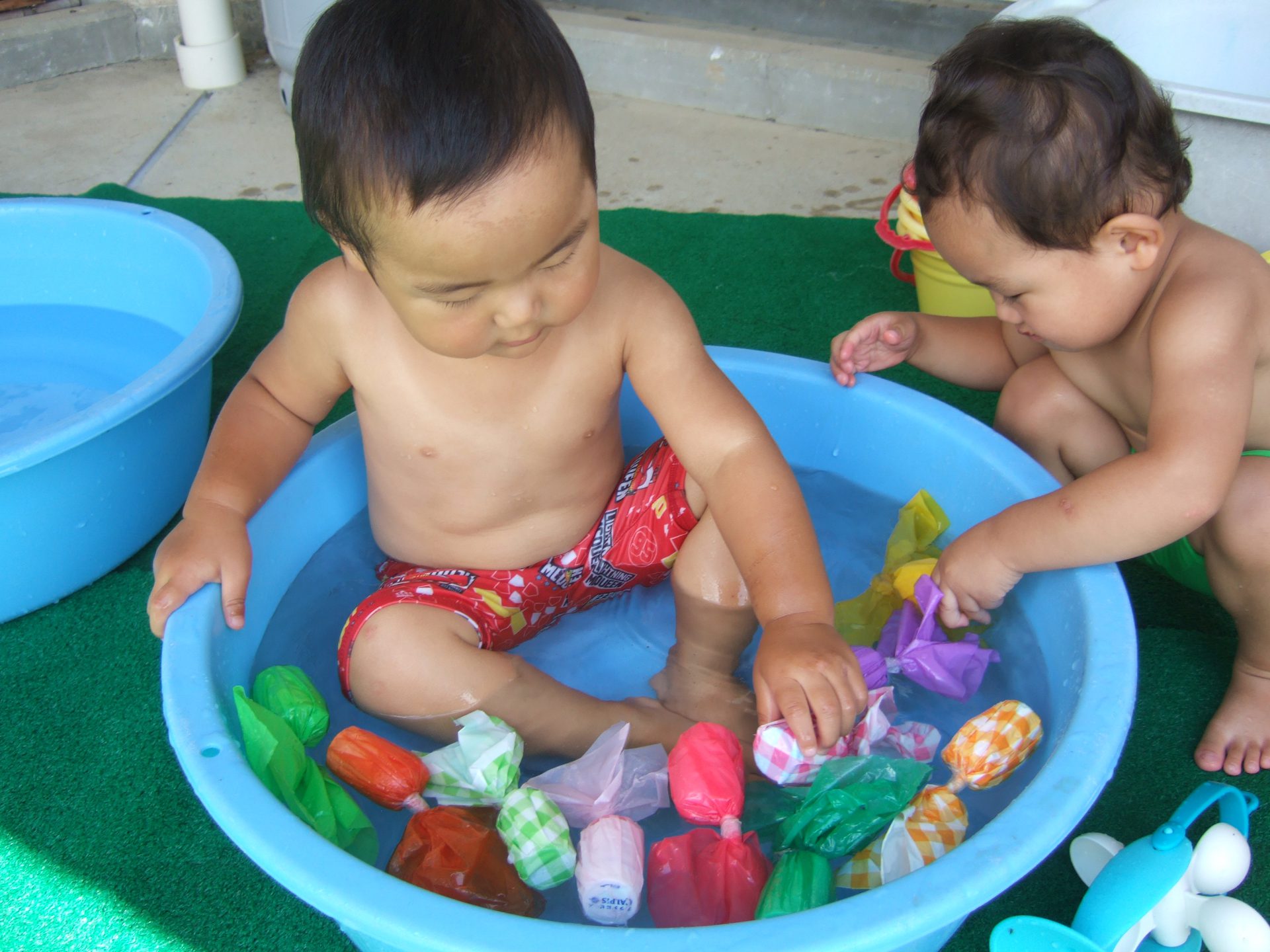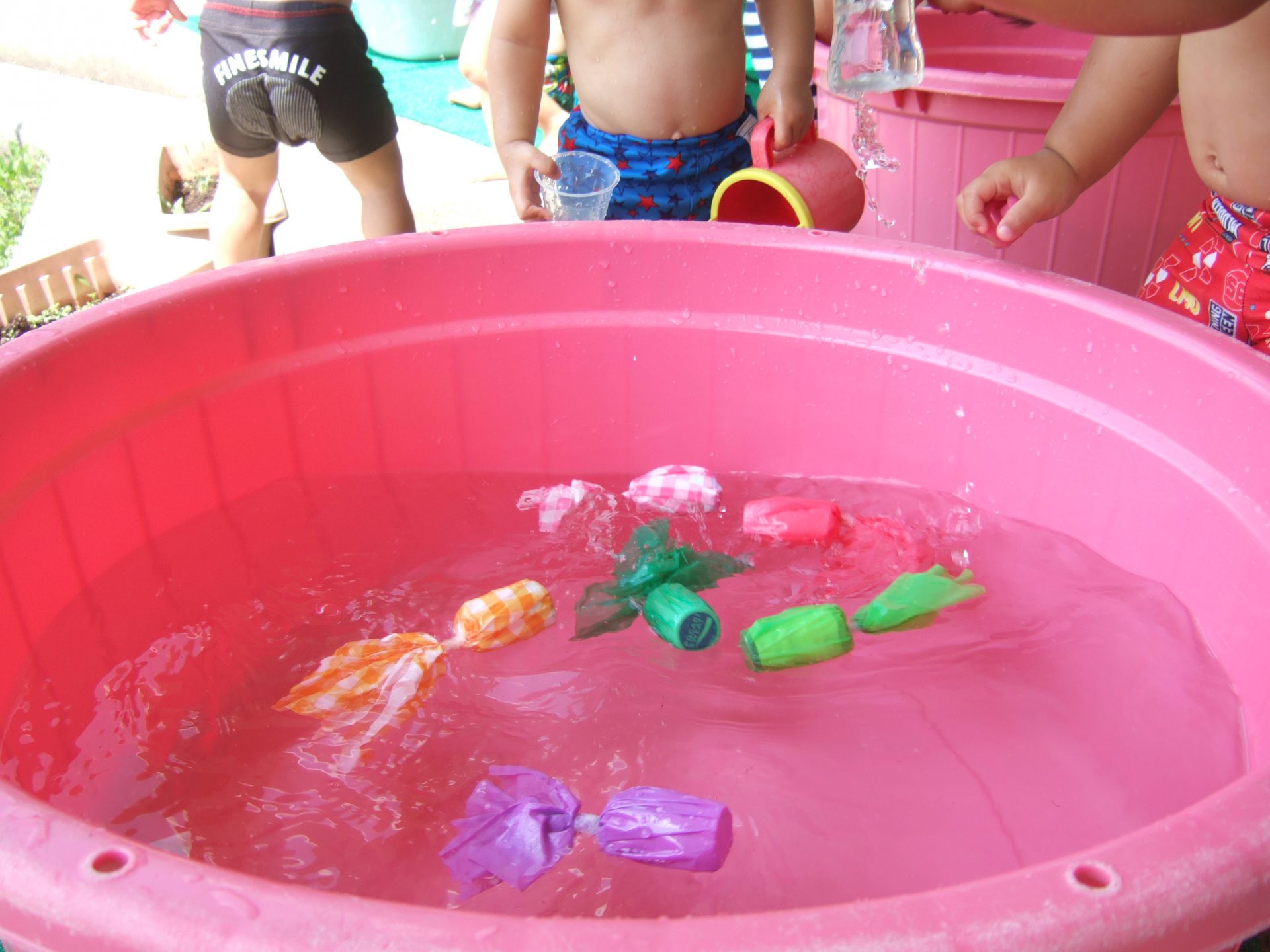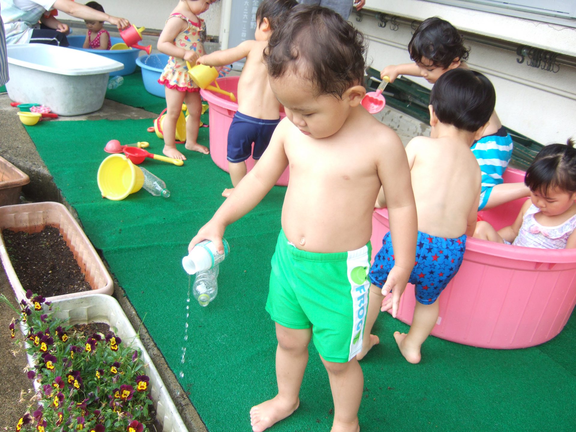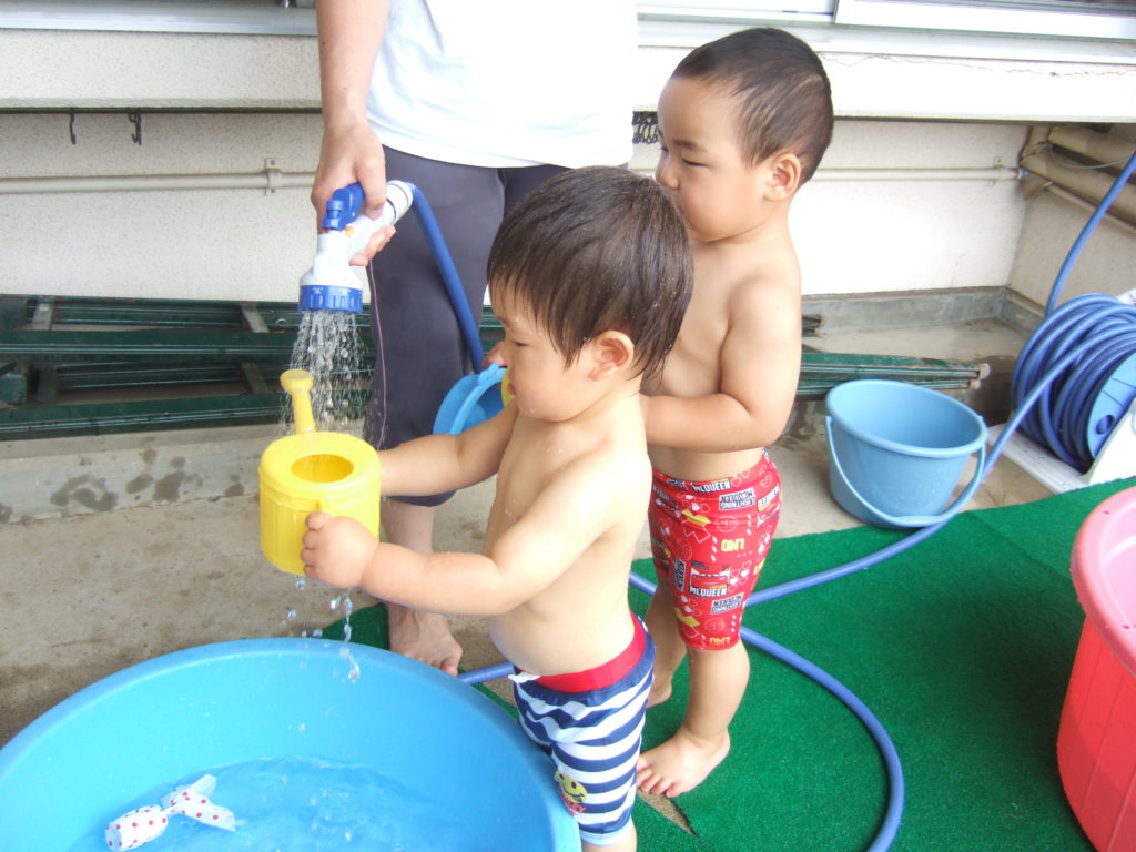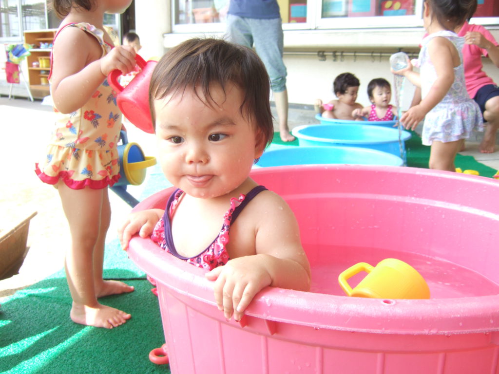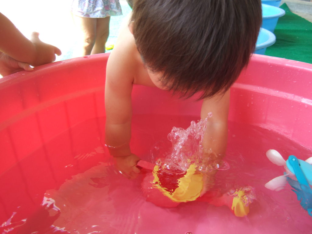 一人ひとりのペースで水と仲良くなっていけるよう、0歳児のお友達は最初は好きな玩具で遊んだり、保育士が体にお水をかけたりして遊んできました。