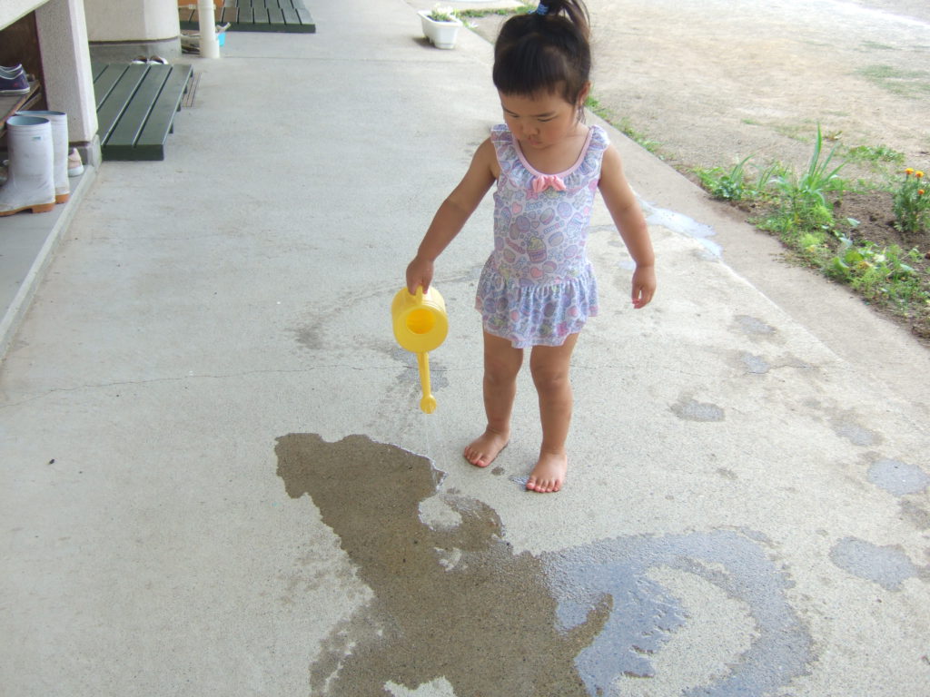 ジョーロで十分に遊んだお友達。最近はペットボトルシャワー、カップなど様々な入れ物に手を伸ばし、水を入れては流すことを楽しんでいます。ジョーロで遊んでいるだけにも見えますが、繰り返してやってみたり、自分でできるようになったり、といろいろなドラマがあるんです!子どもの遊びは本当に奥が深くて、見れば見るほど素敵ですね。
