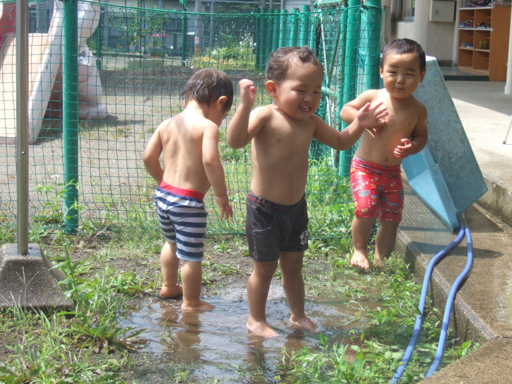 暑い夏だからこそ水の冷たさは心地よいですね!水にたくさん触れながら、いろいろな遊びを通して体全体でお水に触れて楽しんでいきたいなと思います。