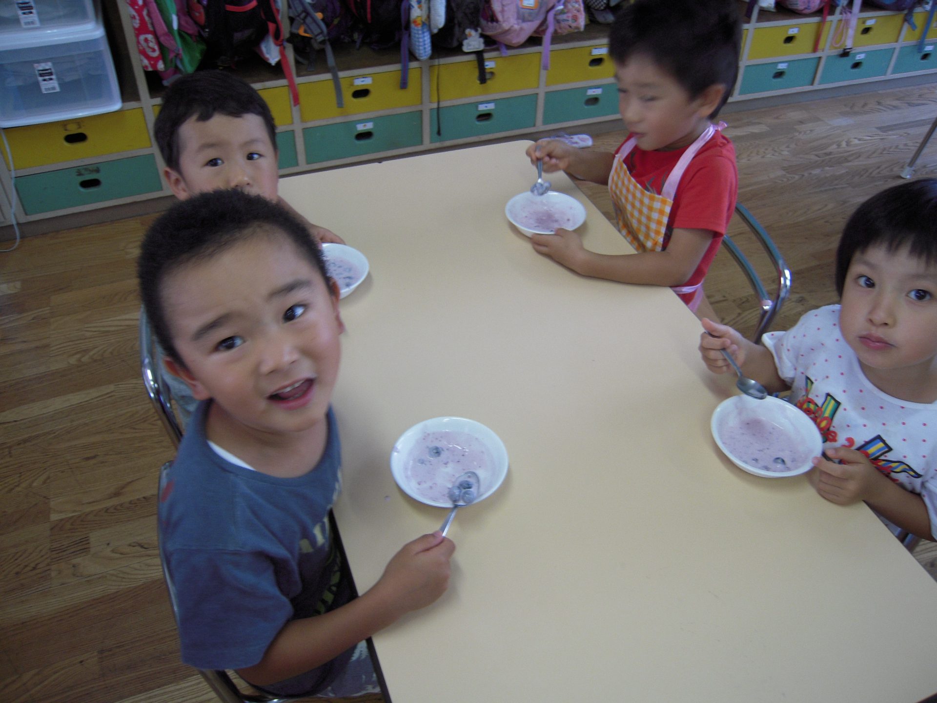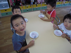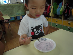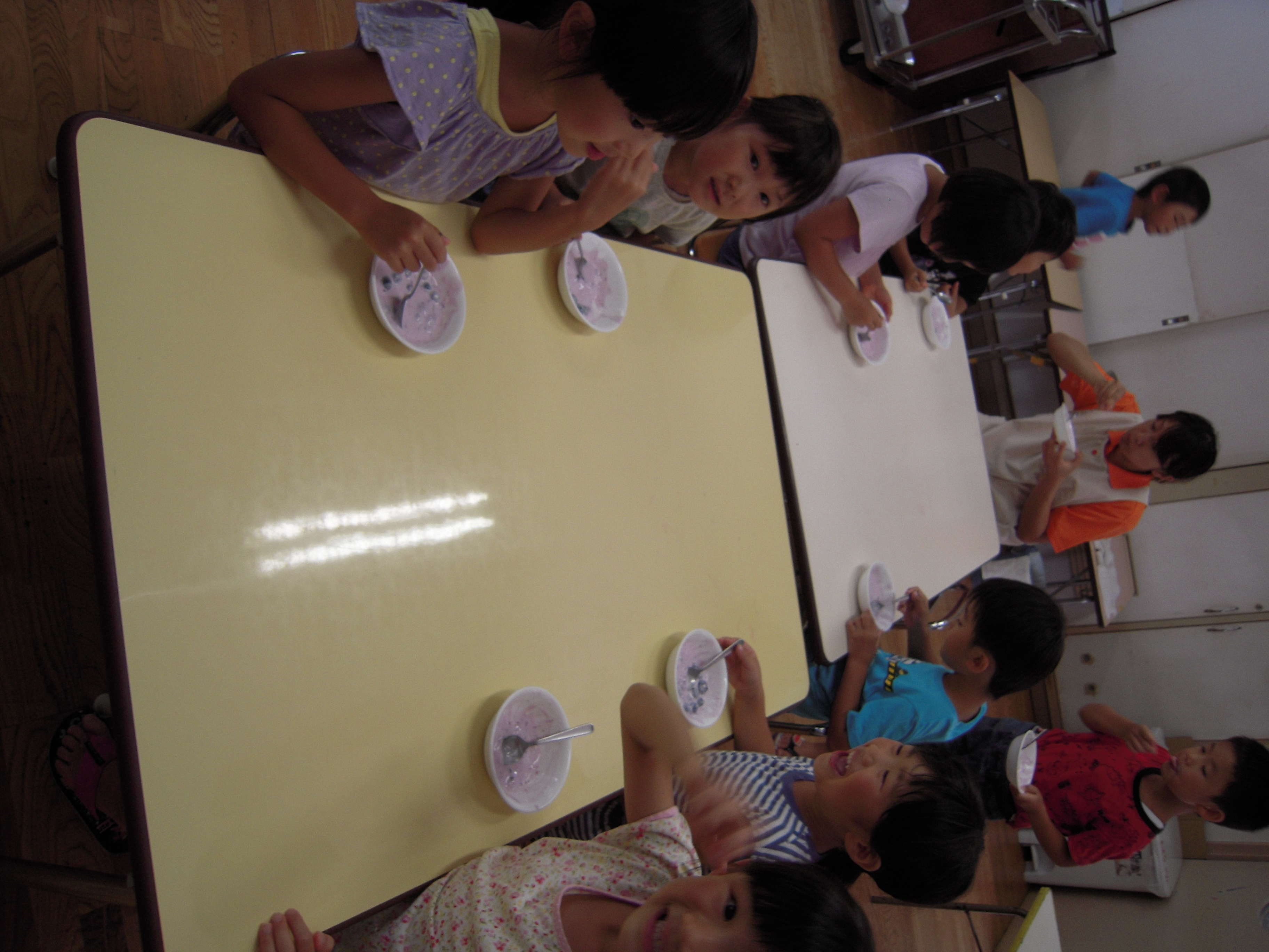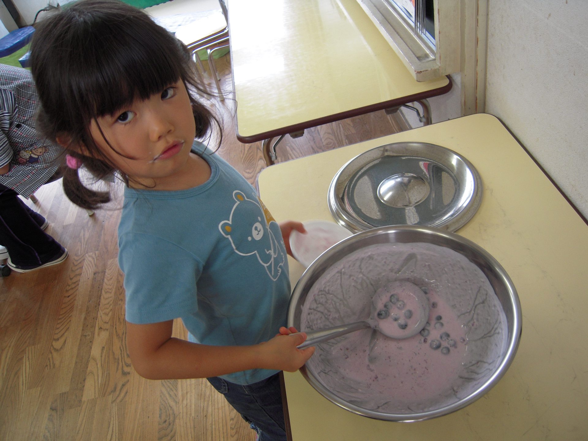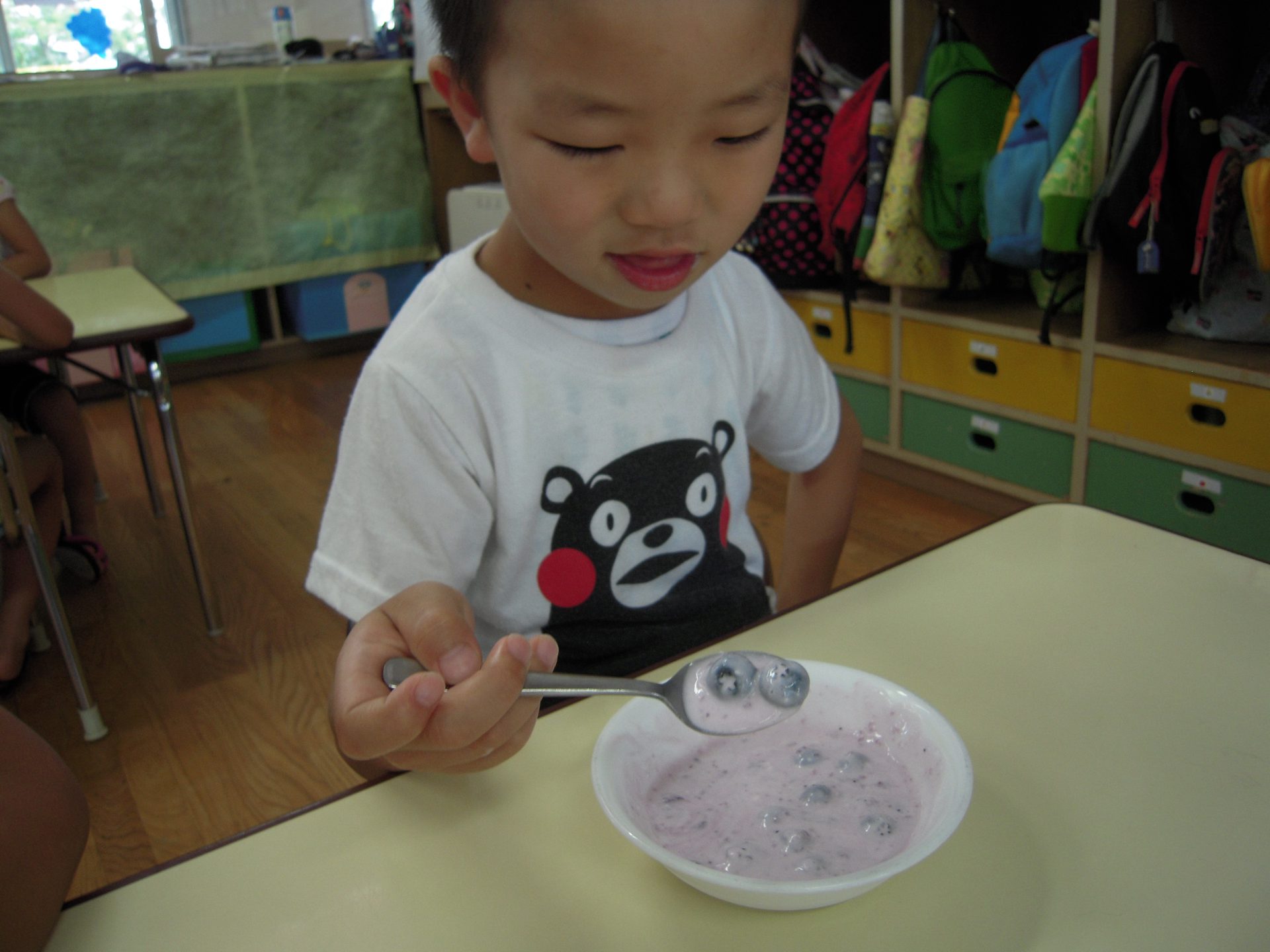 年長児にはブルーベリーのつみとり体験の思い出と合わせて、おやつでもまたみんなでブルーベリーを味わえたことが、子ども達の中でまた良い思い出となってもらえたら嬉しいなと思います。
