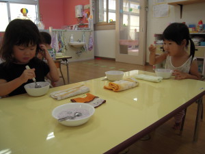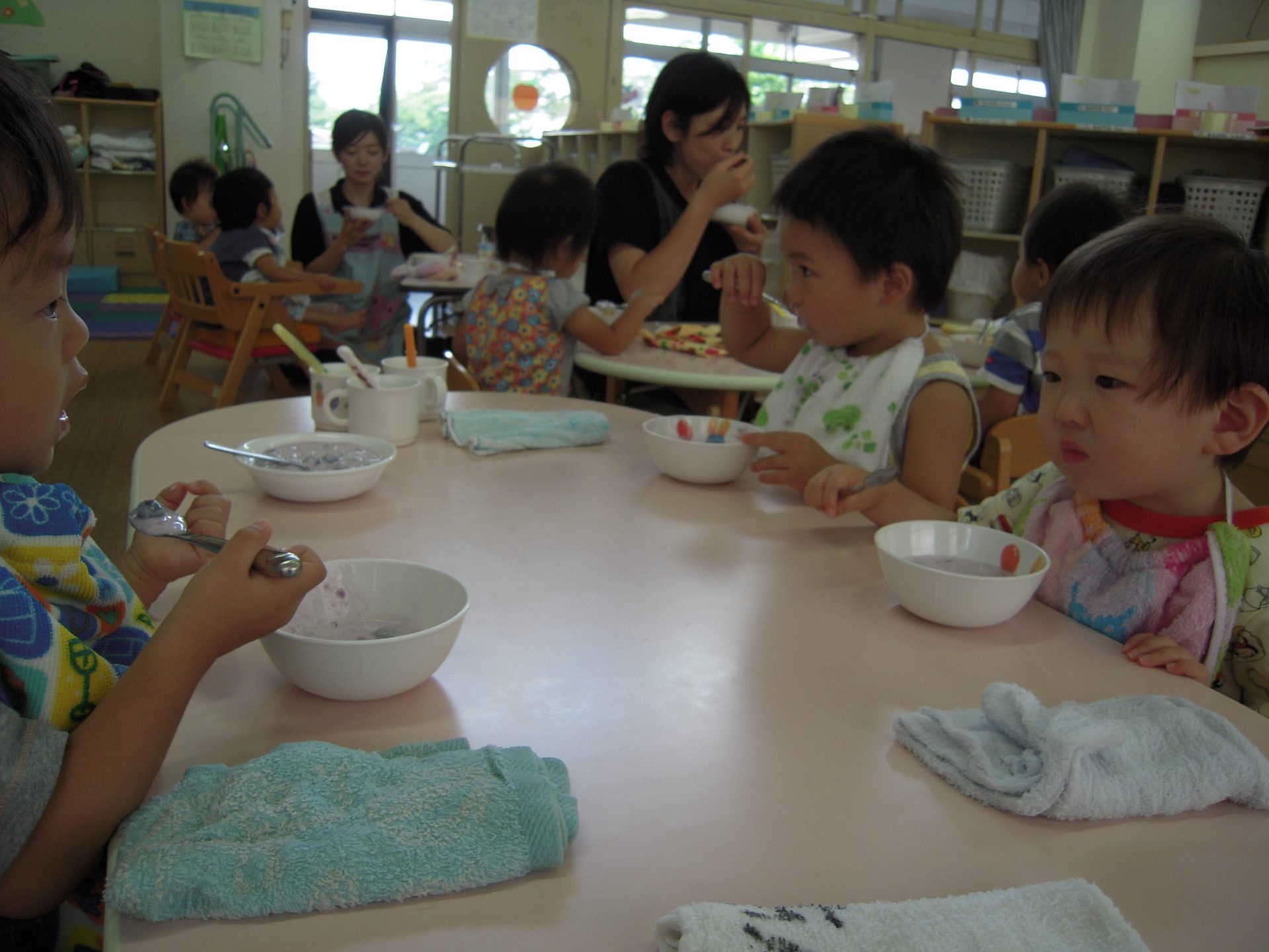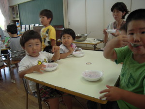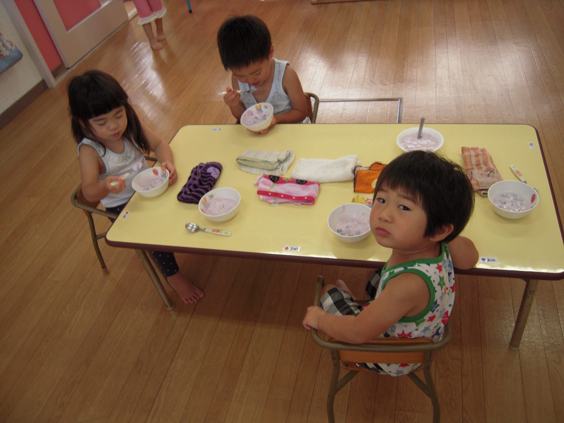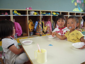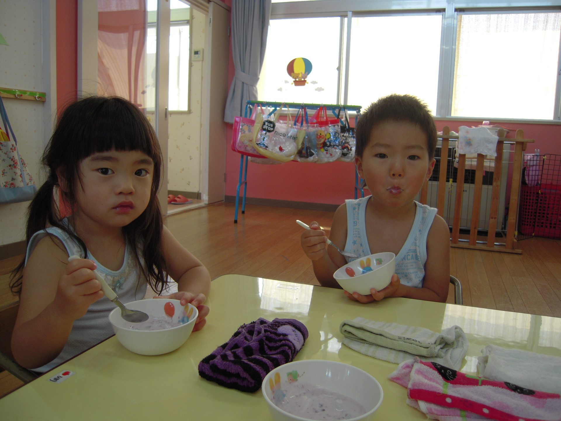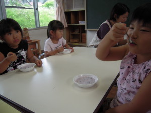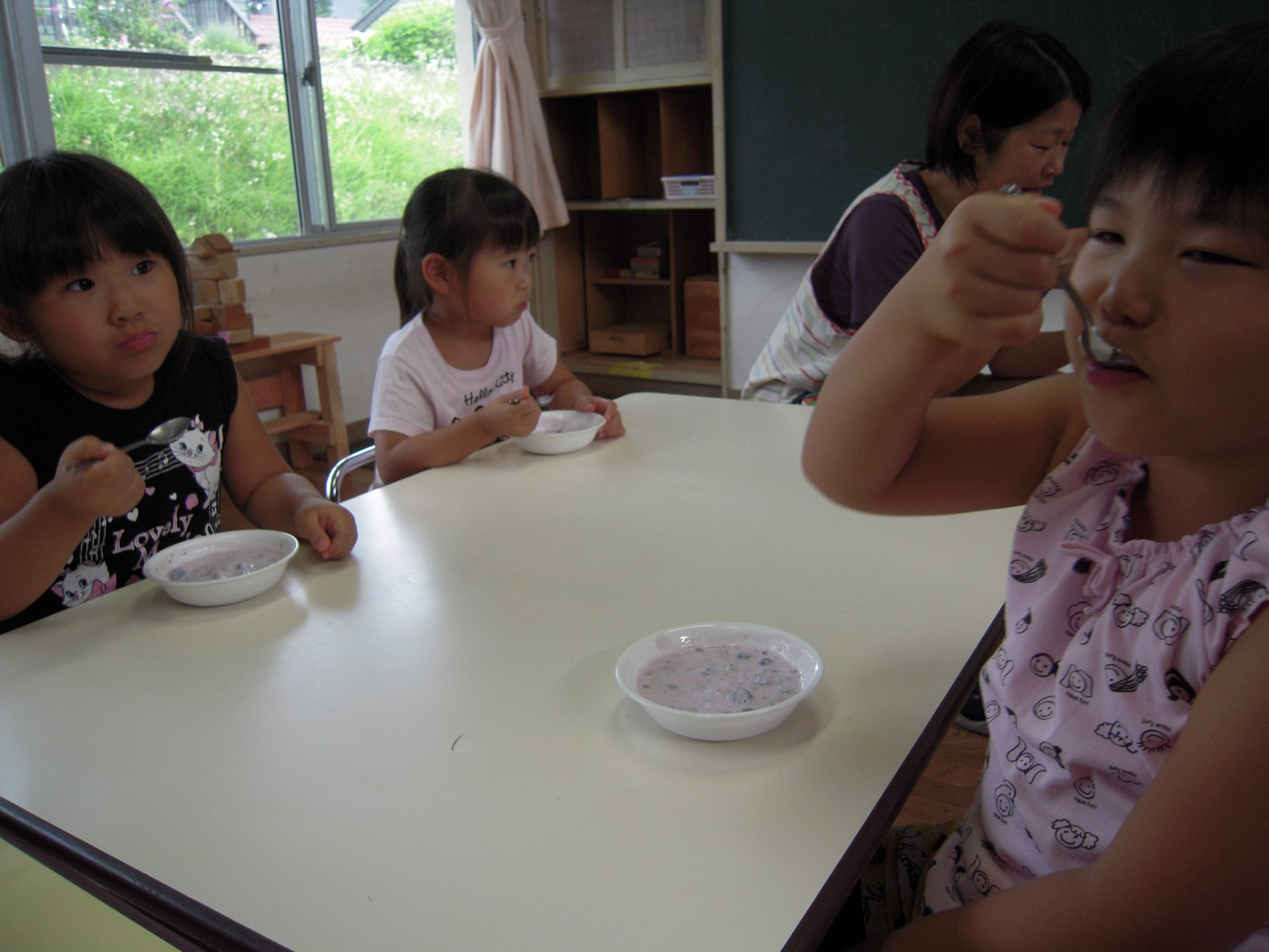 年長児にはブルーベリーのつみとり体験の思い出と合わせて、おやつでもまたみんなでブルーベリーを味わえたことが、子ども達の中でまた良い思い出となってもらえたら嬉しいなと思います。