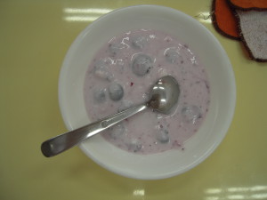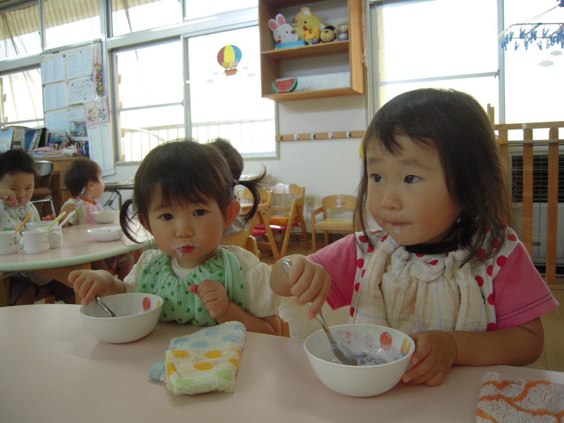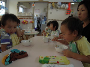ヨーグルトがおやつの時は、やっぱり可愛らしいお口のまわりの0.1歳児さんですね。