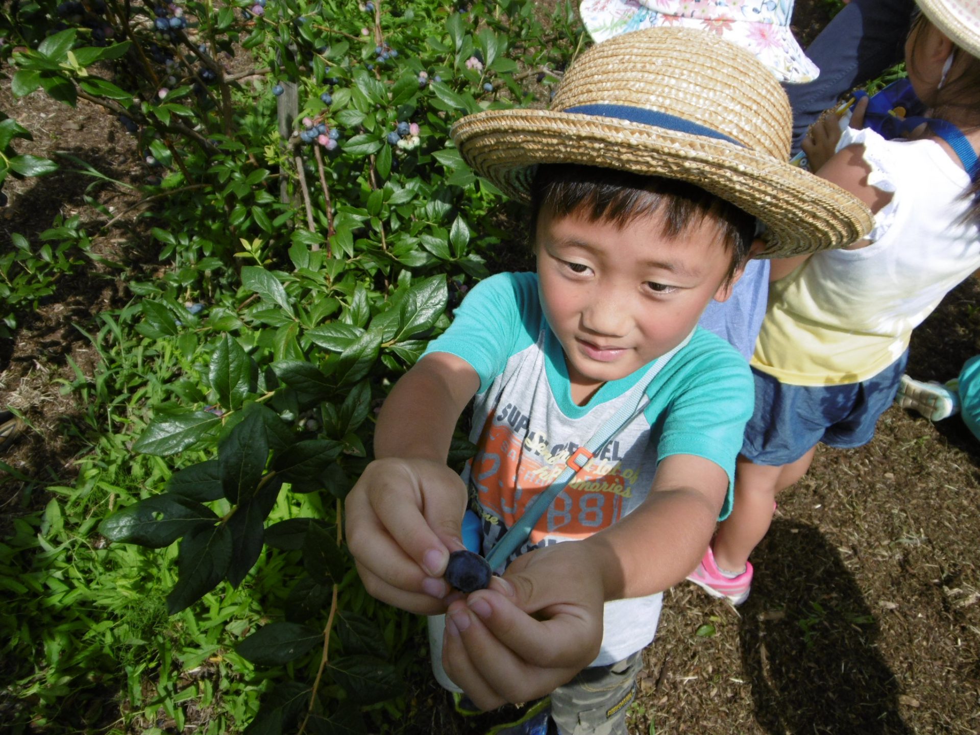 見てみて!とたくさんブルーベリーを手にした男の子。自分で食べるのではなく、お友達に配って歩いていました。