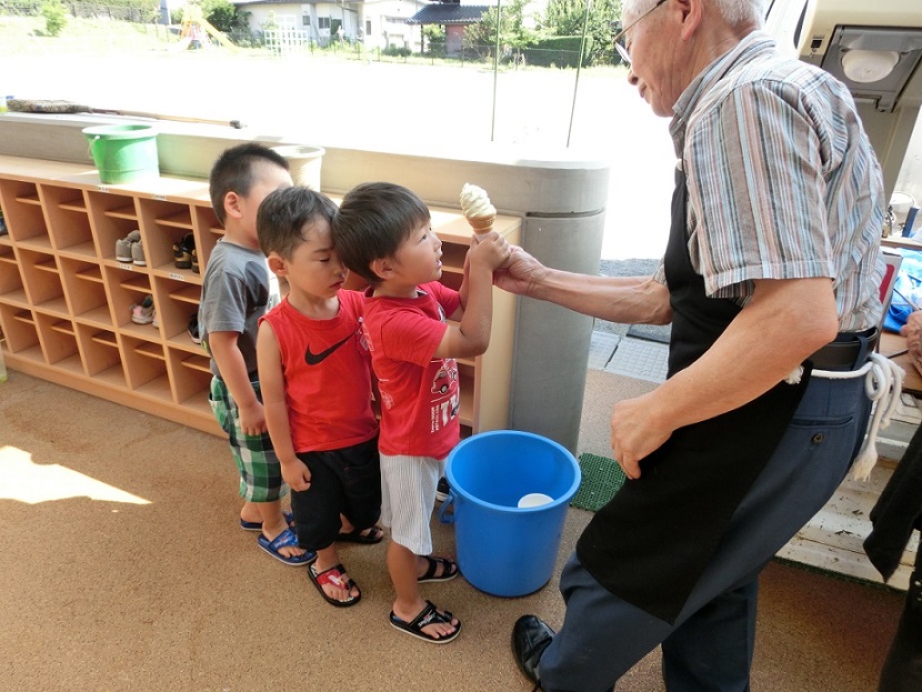 東みのわ保育園では、保育園のお昼を納入してくださる業者の方のご厚意でおやつにソフトクリームを提供してくれました。