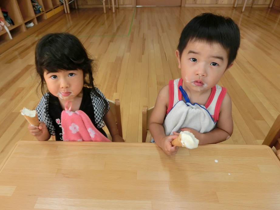0歳児1歳児のおやつはヨーグルトです。ソフトクリームはもう少し大きくなってのお楽しみ。