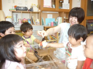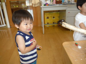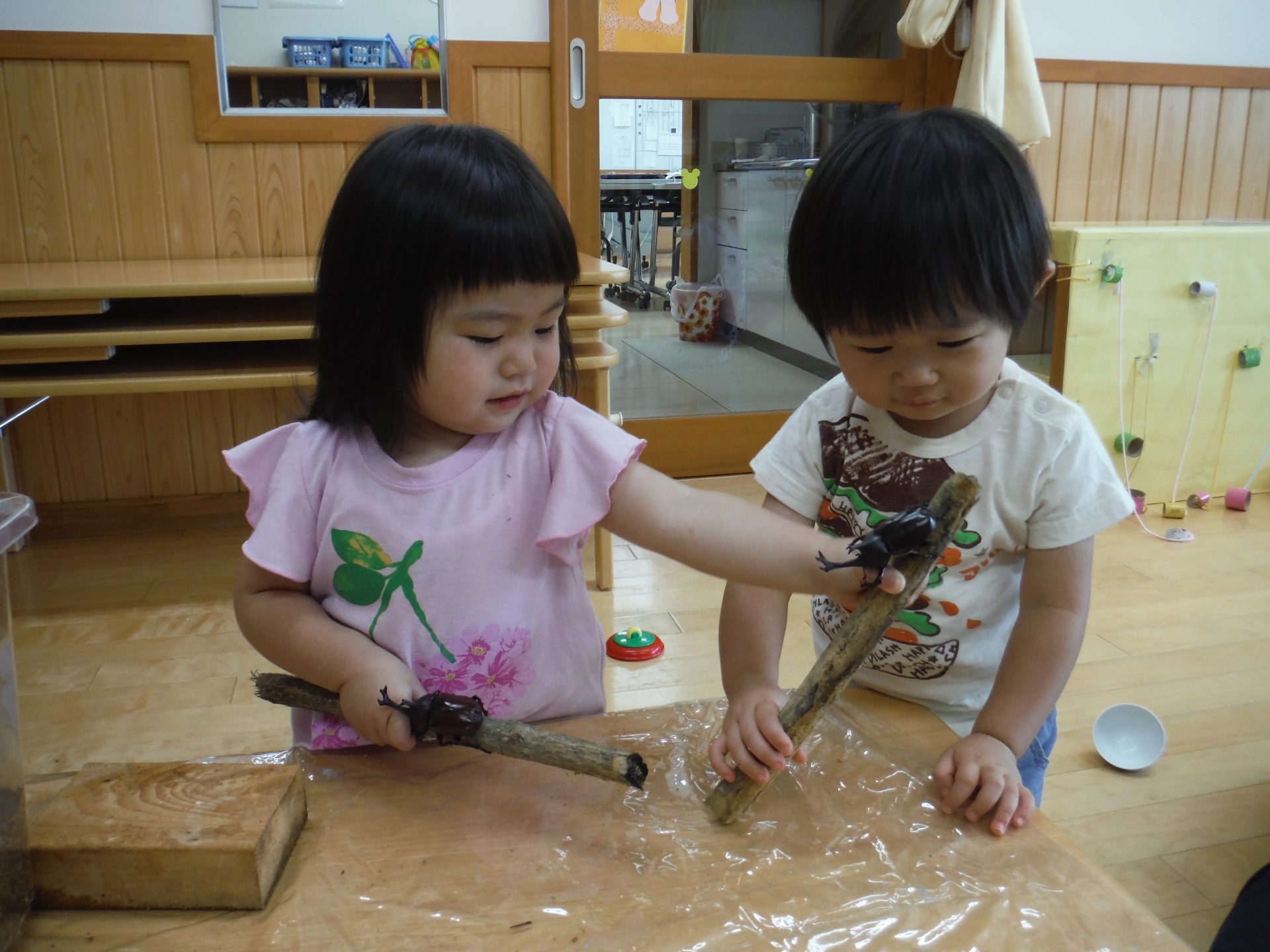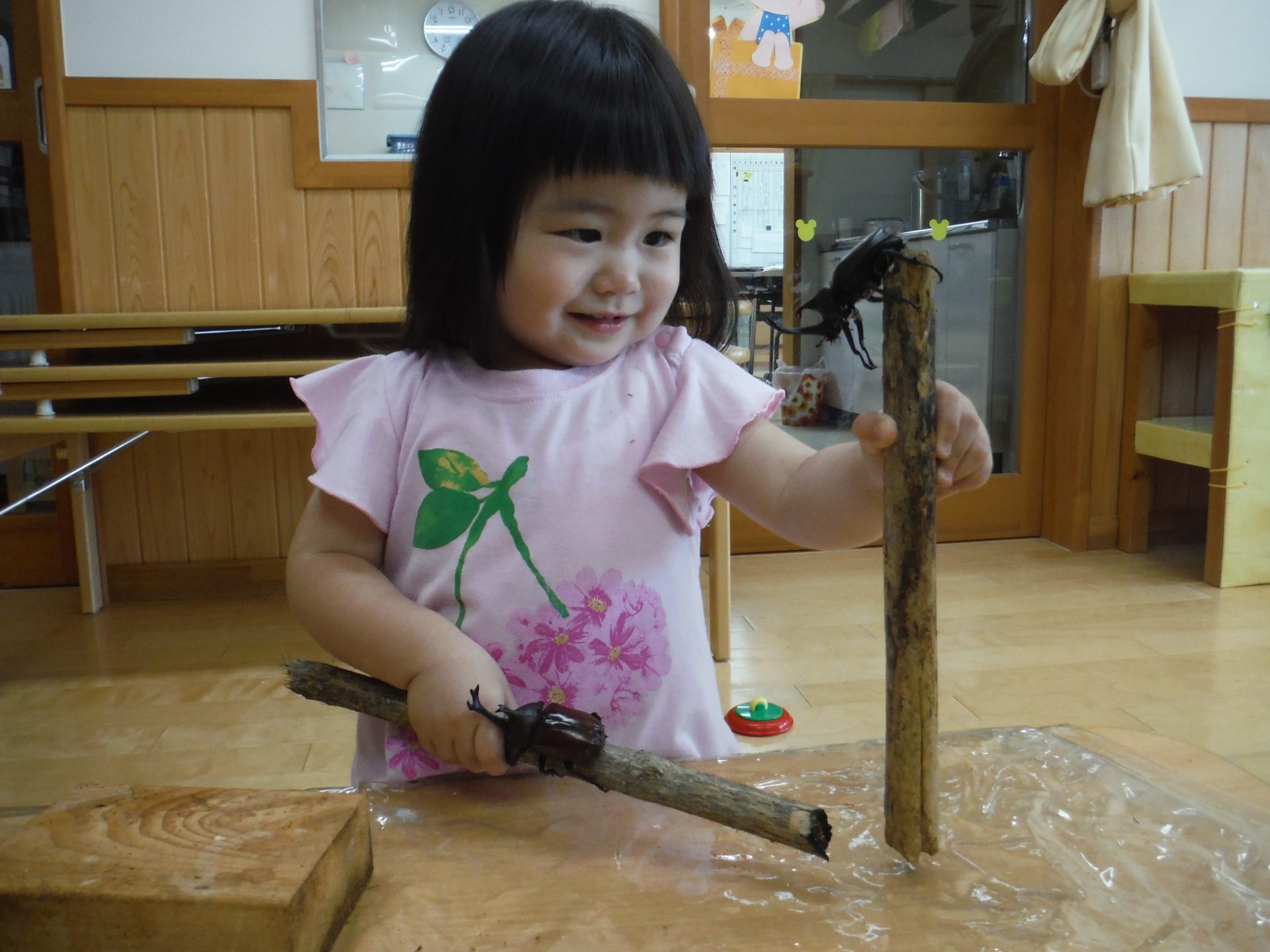 夏の人気者カブトムシをたくさん飼い始めました! 0・1歳児の反応はどうかな…?と思いましたが、意外や意外大喜びでした。 「かぶとムシ見せて」と指さして要求する子や土を掘ってカブトムシをつかもうとする子もいてみんなカブトムシが大好きになりました。いろんなものに触れて大きくなあれ!