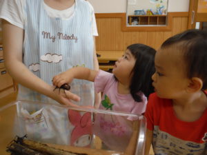 保護者からいただいたかぶと虫に、興味はあるものの、初めは怖くて遠くから見ていた子どもたち。