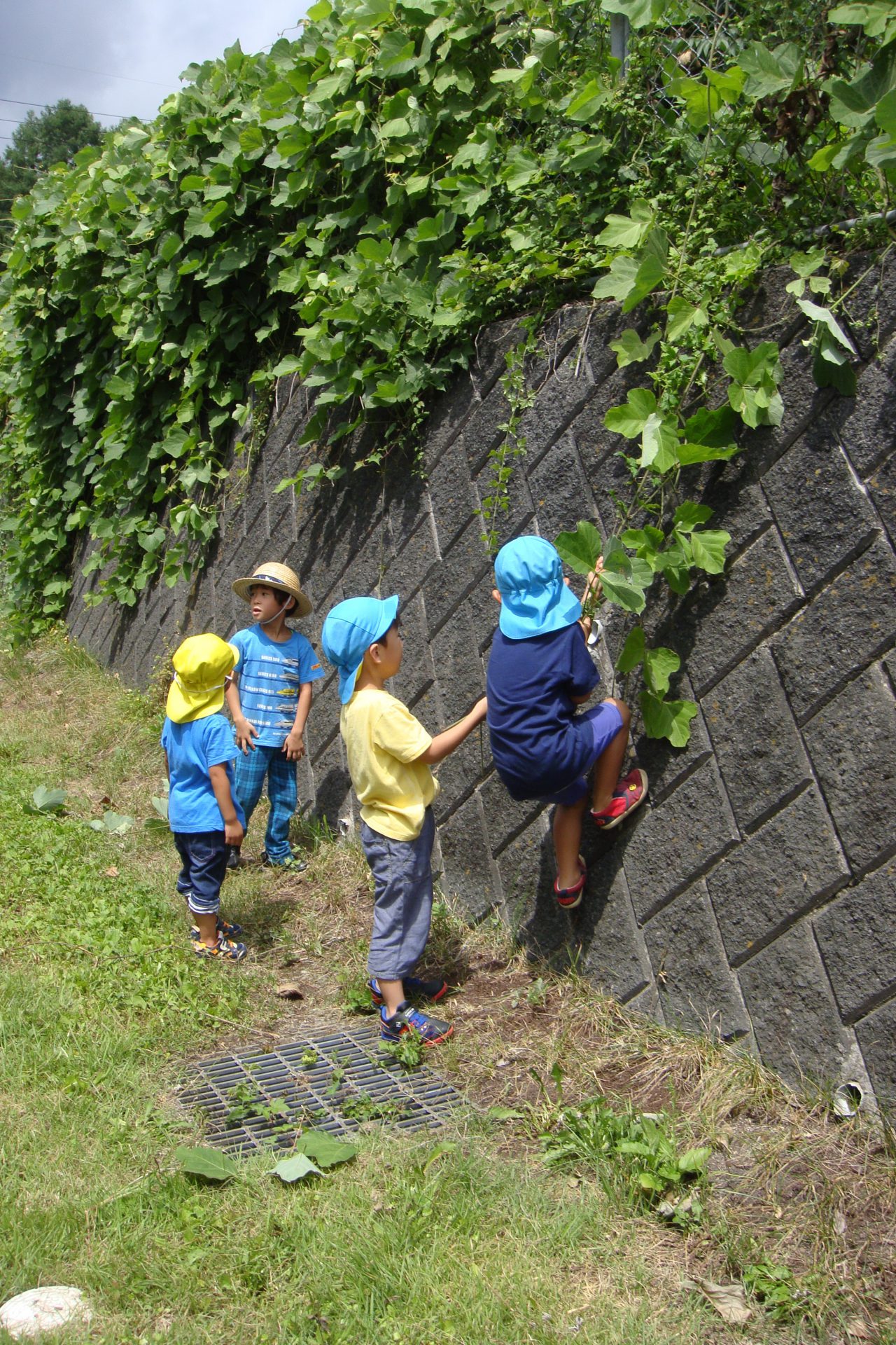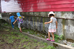 青空の下、外に出て遊んでいると園舎の横で何かを見つけた子ども達。