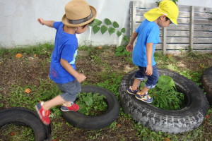 「平均台みたい!!」とちょっとした所でも遊びを見つける子ども達。