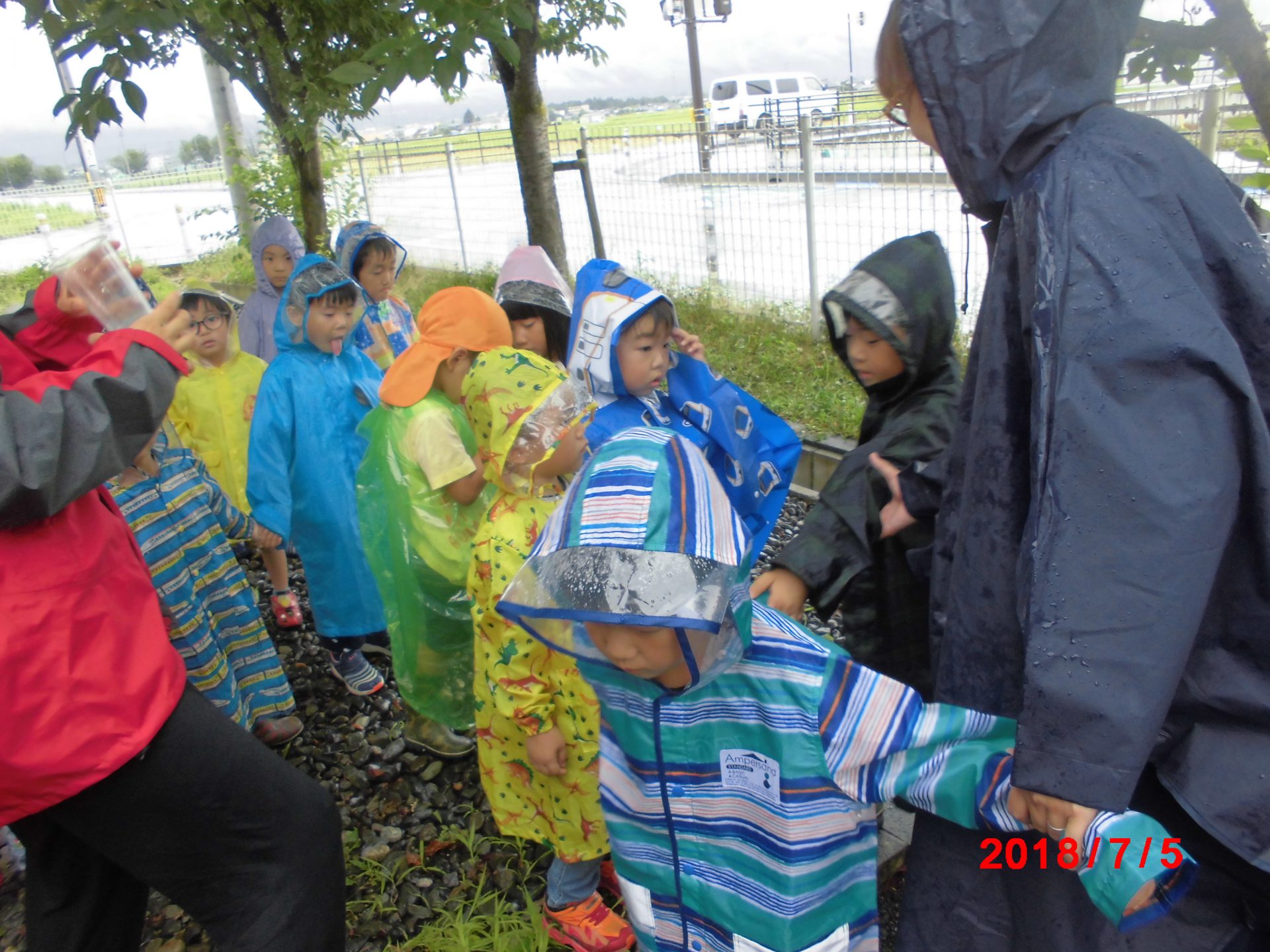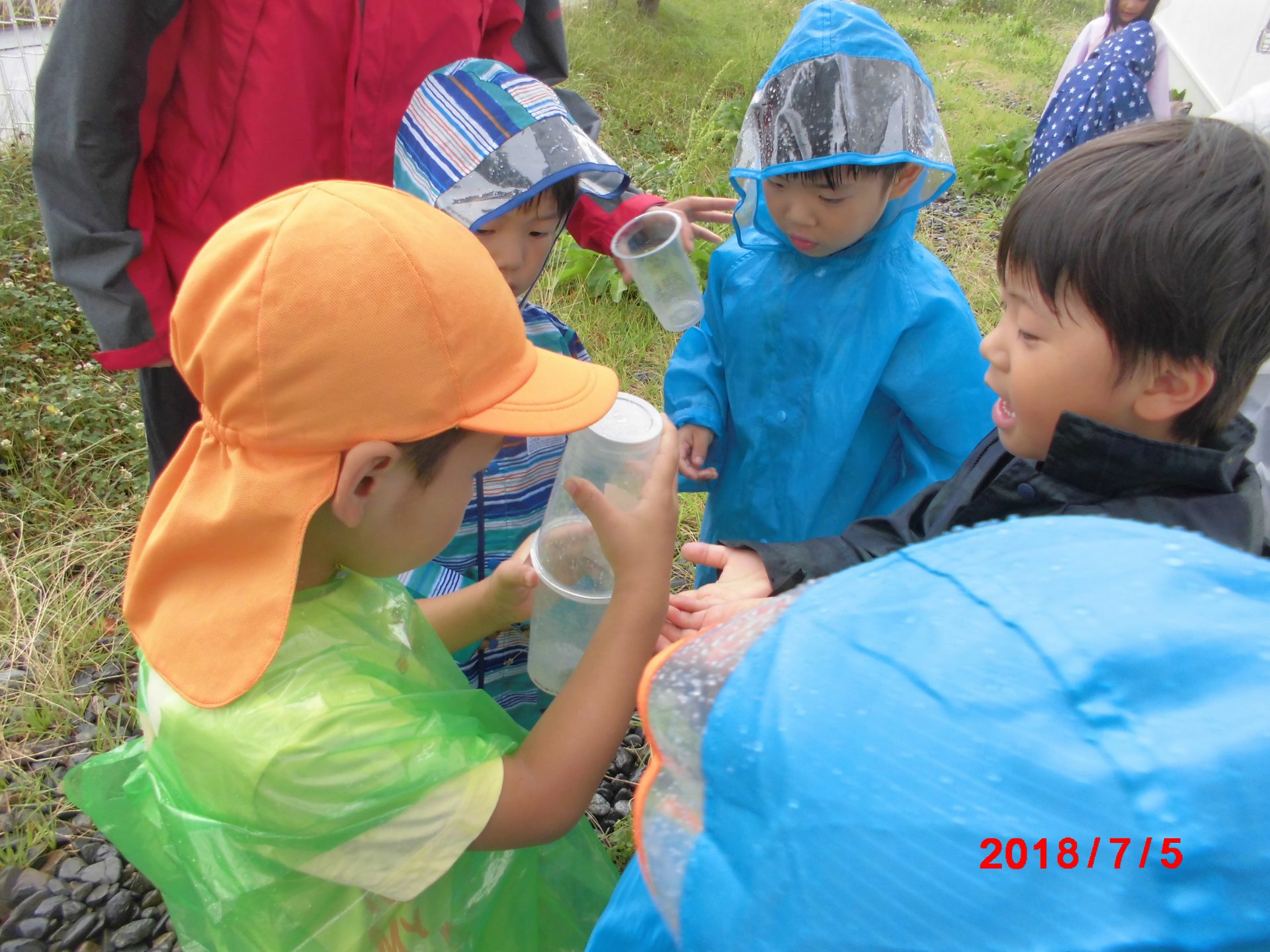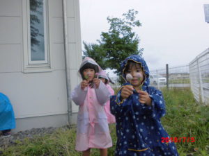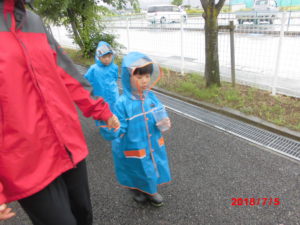 「雨いっぱいだよ!」「かっぱ着て行こうよ!」雨に大はしゃぎです。