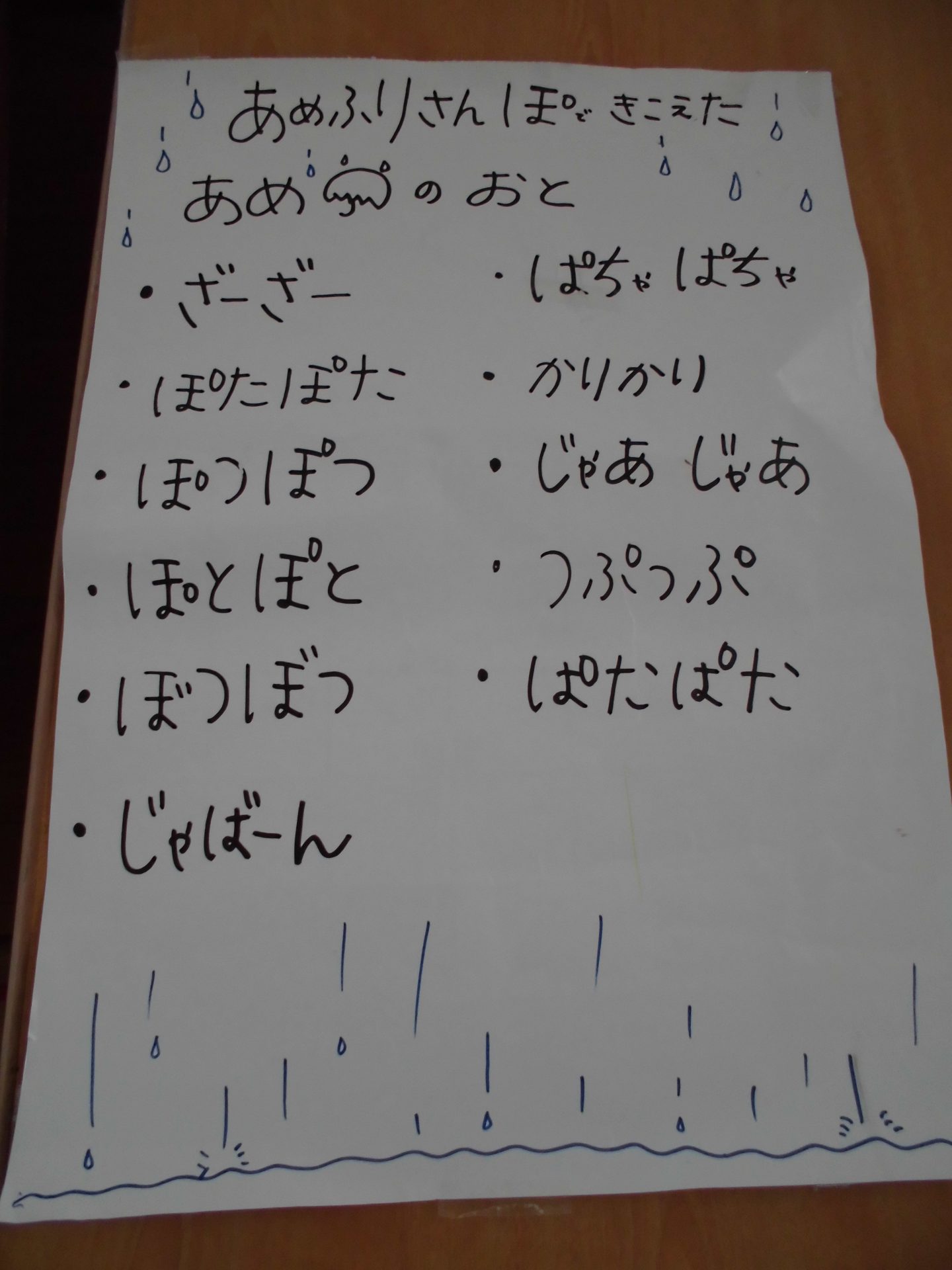 園に戻ってから子どもたちに聞くと、「ぽたぽた」「じゃあじゃあ」「つぷつぷ」・・・